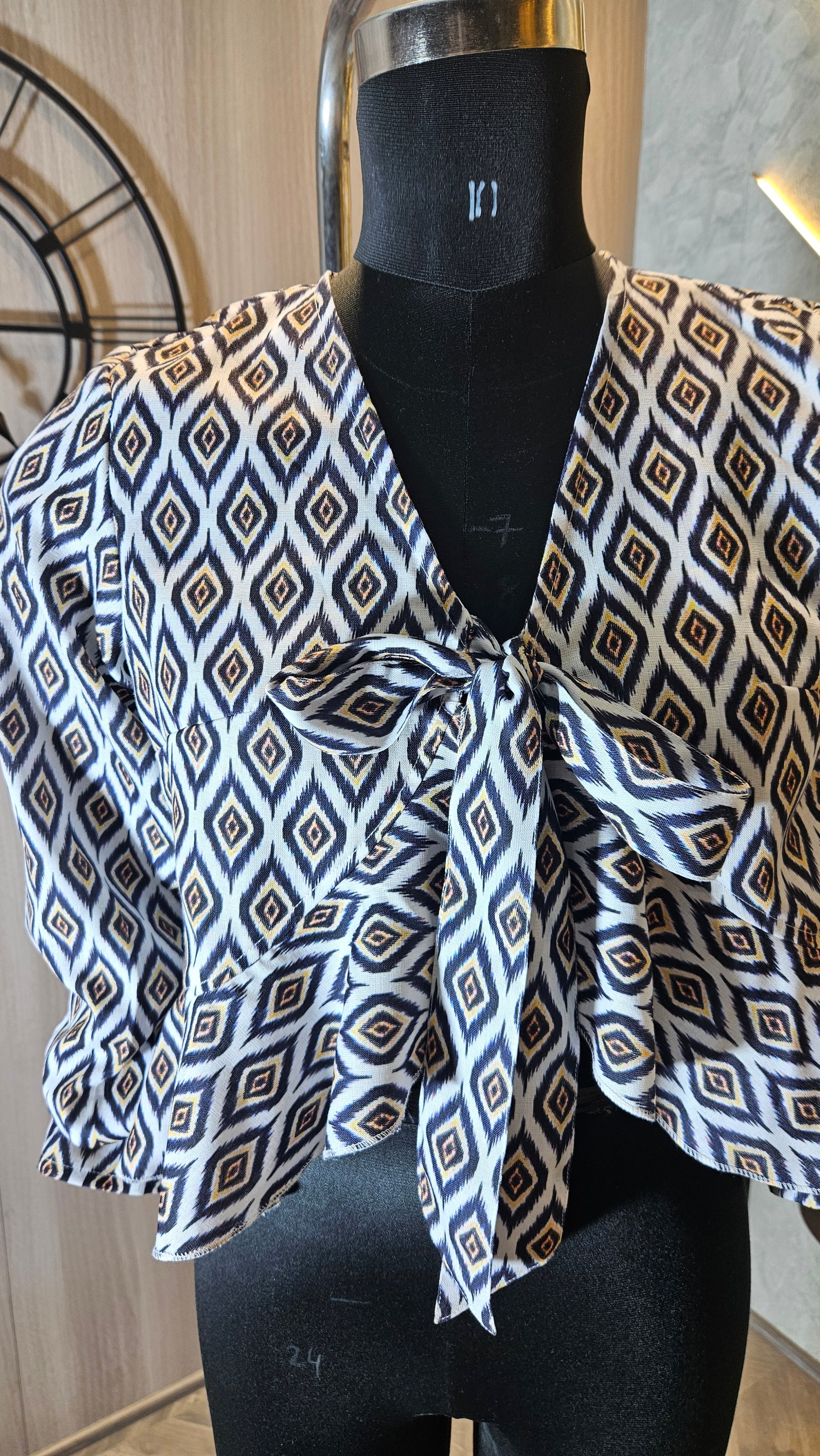 Design: All-over Ikat diamond print with tie-knot front