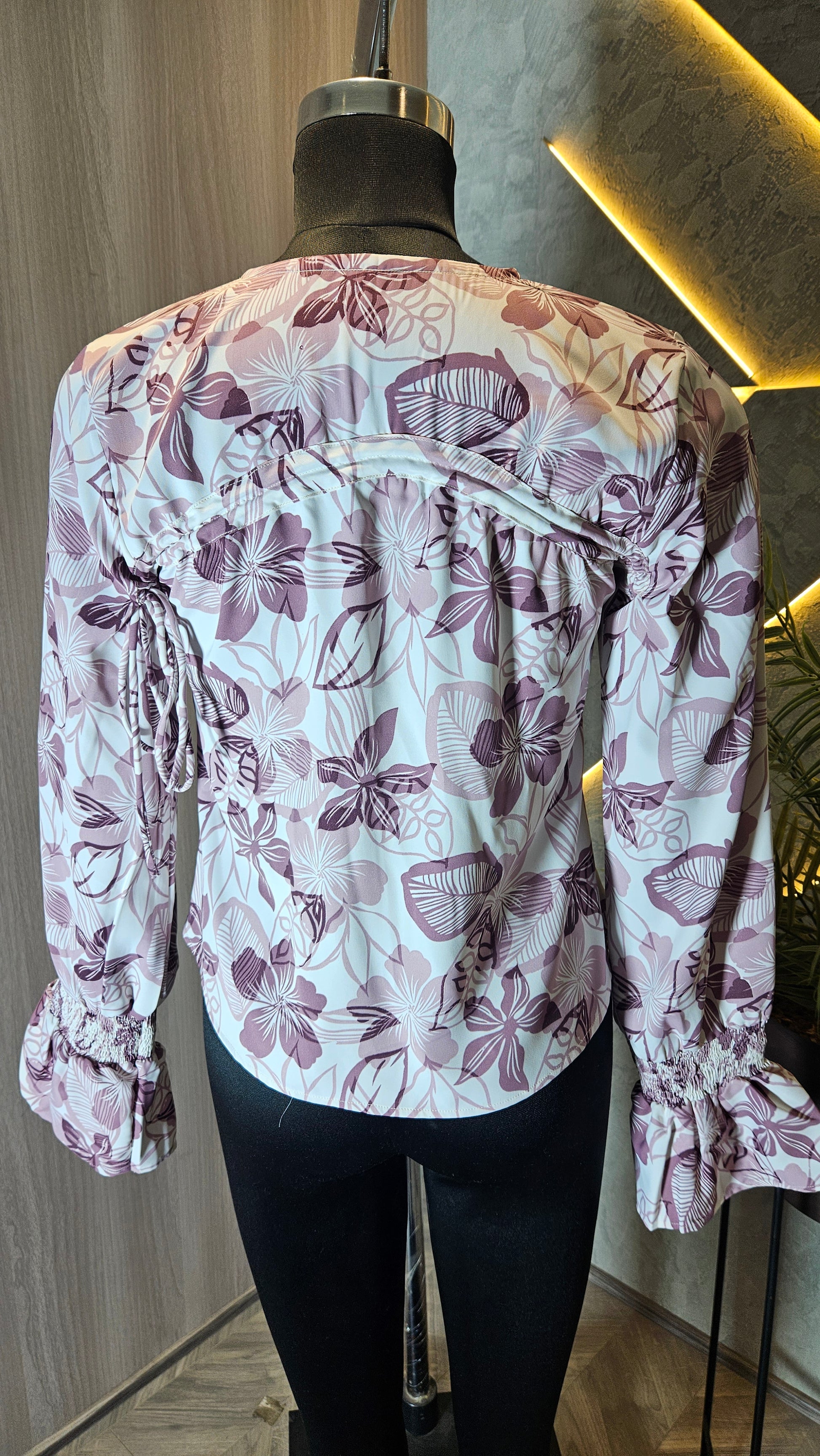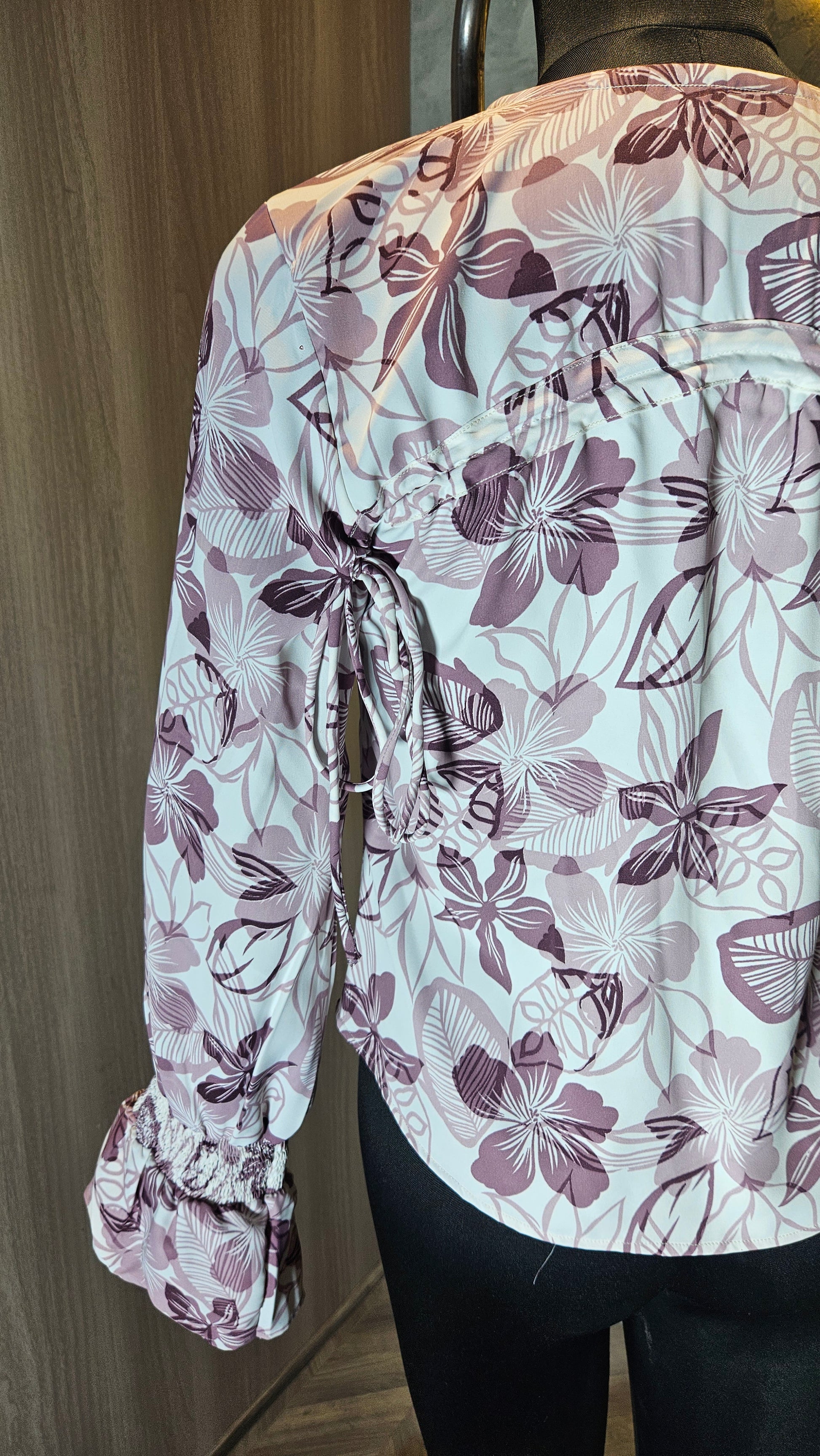 Perfect for spring and summer collections, this long sleeve blouse includes smocked cuffs with a slight ruffle, enhancing both comfort and style. The asymmetrical hem and adjustable front tie make it suitable for a range of body types, offering versatility for casual outings, beach vacations, and partywear.