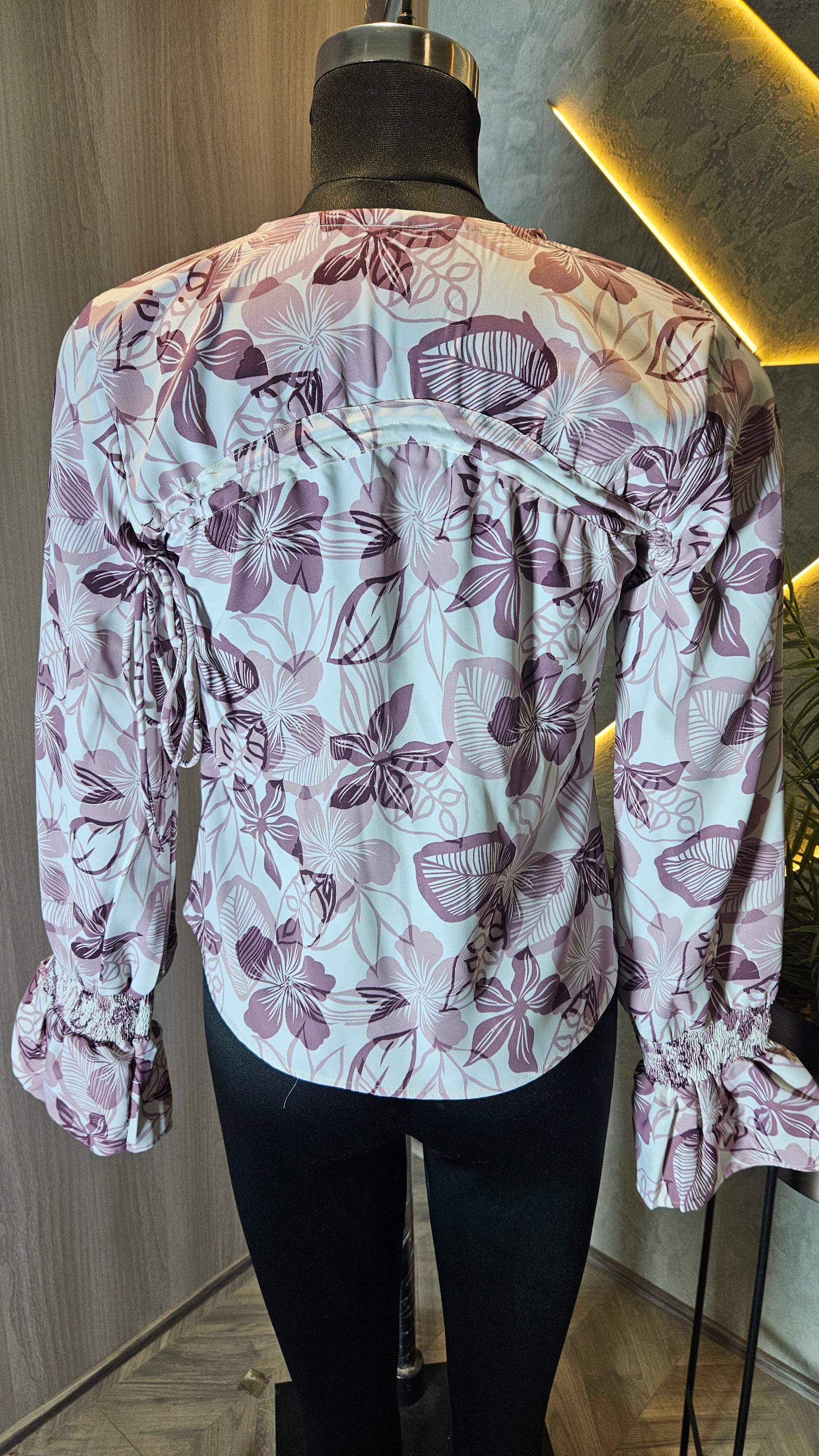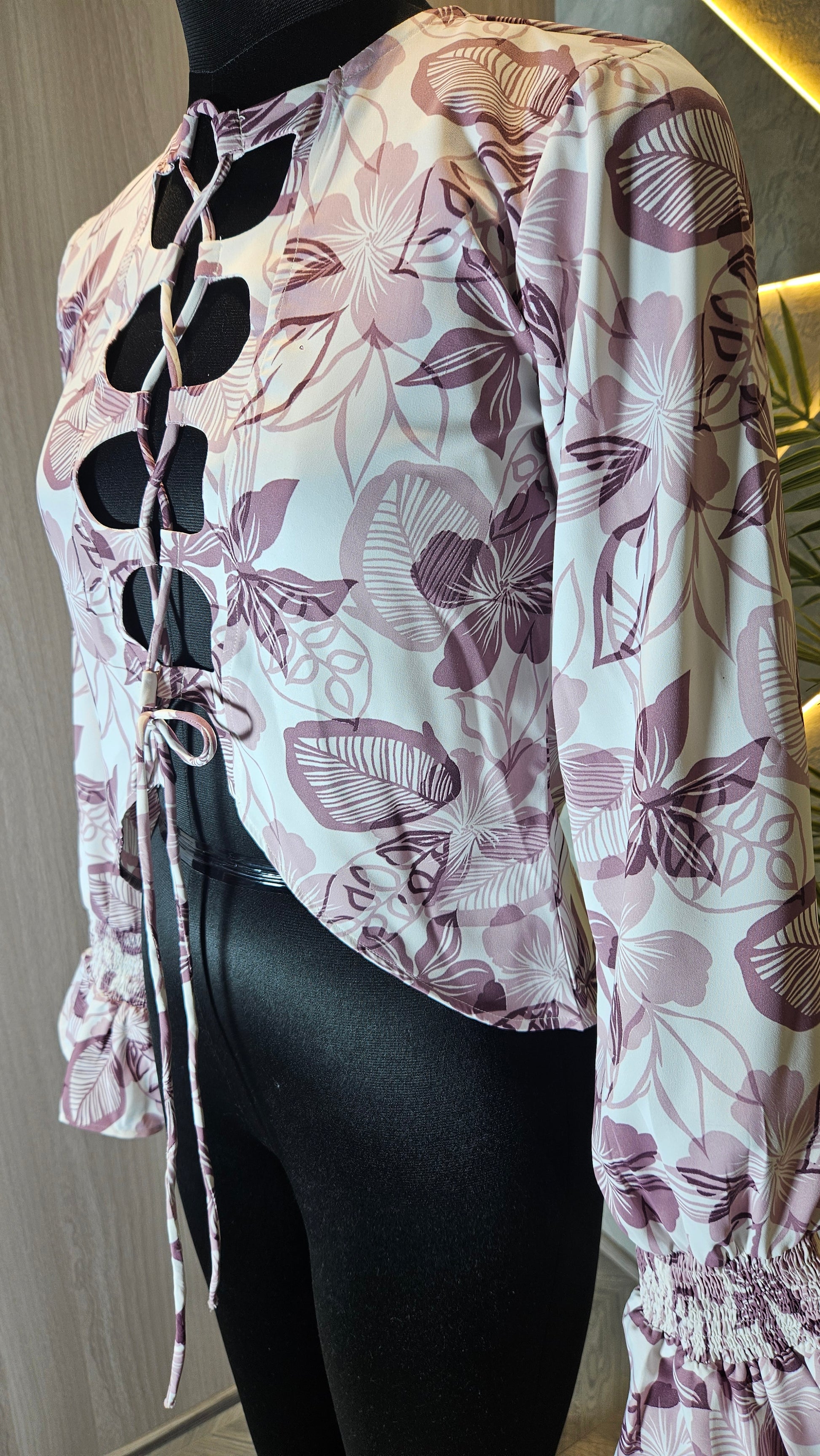 Elevate your collection with this trend-forward Floral Cut-Out Lace-Up Front Blouse, designed for the fashion-conscious woman. Crafted in India using high-quality, breathable fabric, this crop top features a striking floral print in soft pink and mauve tones. The unique front cut-out design is accentuated with crisscross lace-up detailing, creating a bold yet elegant statement piece.