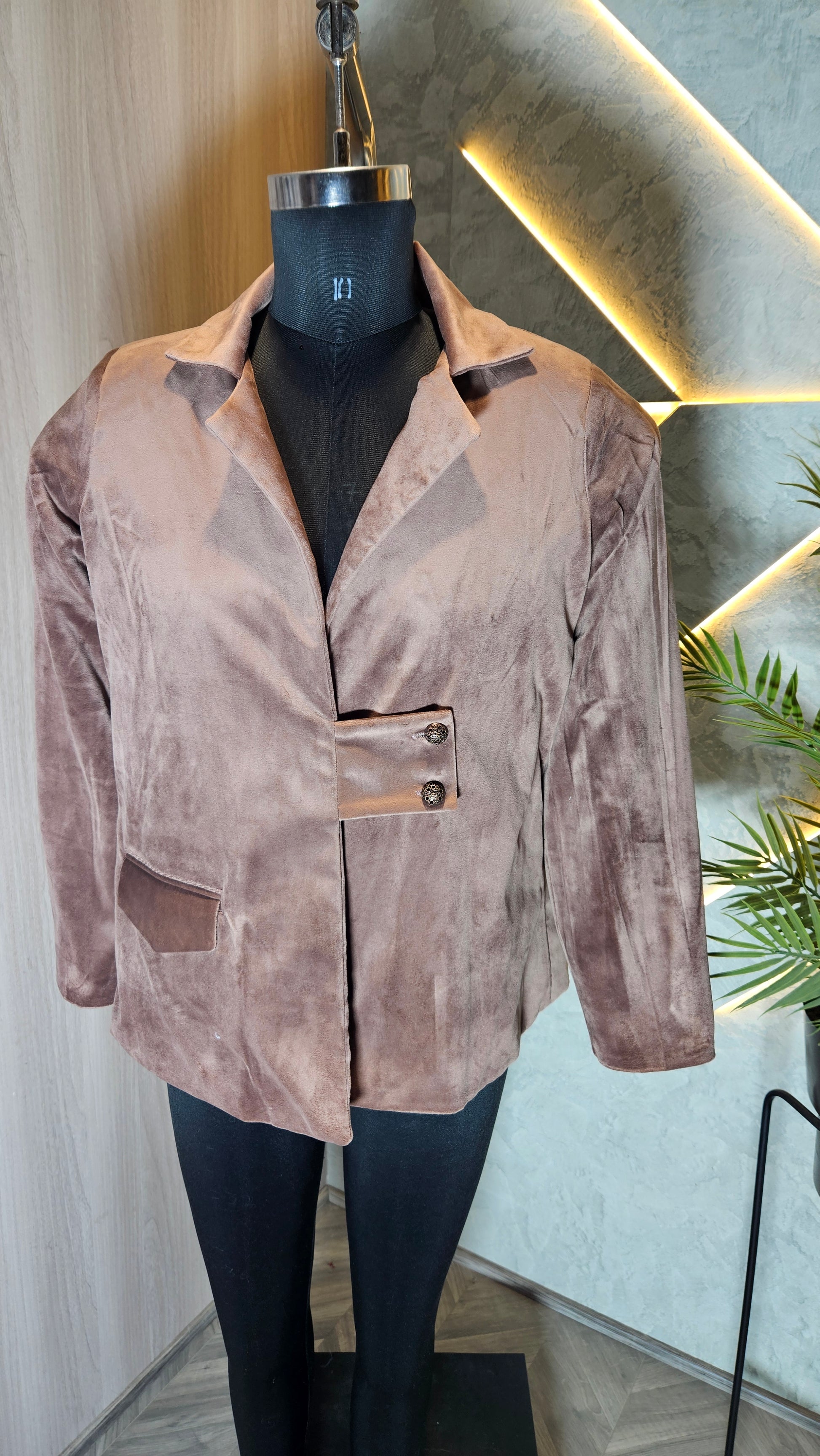 Elevate your fashion collection with our Velvet Luxe Women's Blazer, crafted in India using premium soft-touch velvet with a suede-like finish. This tailored piece features a modern relaxed silhouette, a wide notched lapel, and a unique front strap closure with dual ornate buttons, offering both elegance and uniqueness. The muted mauve-brown tone adds versatility, making it perfect for both formal and semi-casual occasions.