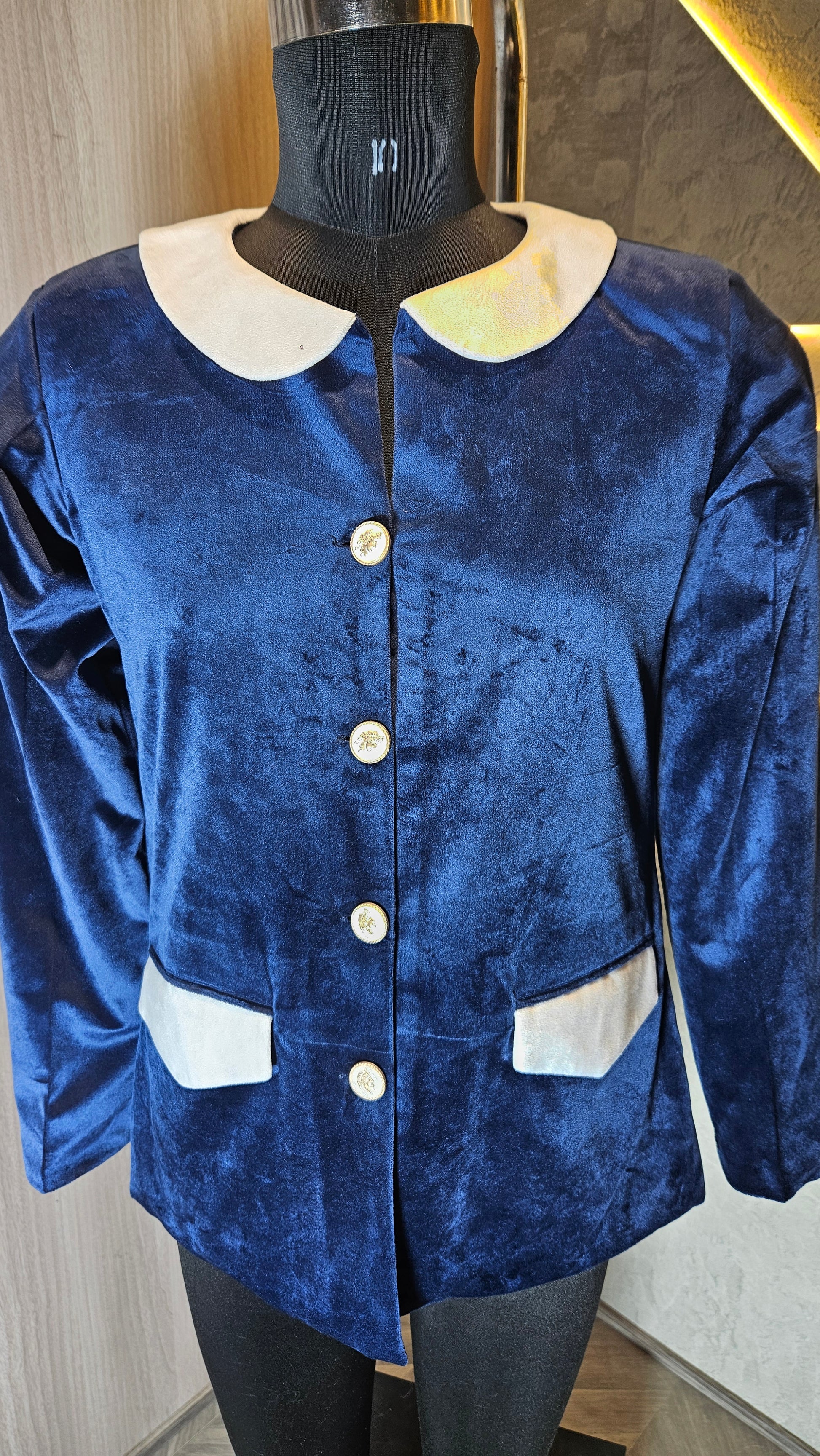 Elevate your collection with this elegant women's velvet top, crafted in a rich navy blue hue with a luxurious sheen. Designed for comfort and style, this top features a contrast white Peter Pan collar, matching white pocket flaps, and decorative gold-tone buttons that add a vintage-inspired charm. The full sleeves and soft velvet fabric ensure warmth and sophistication, making it ideal for autumn/winter collections.