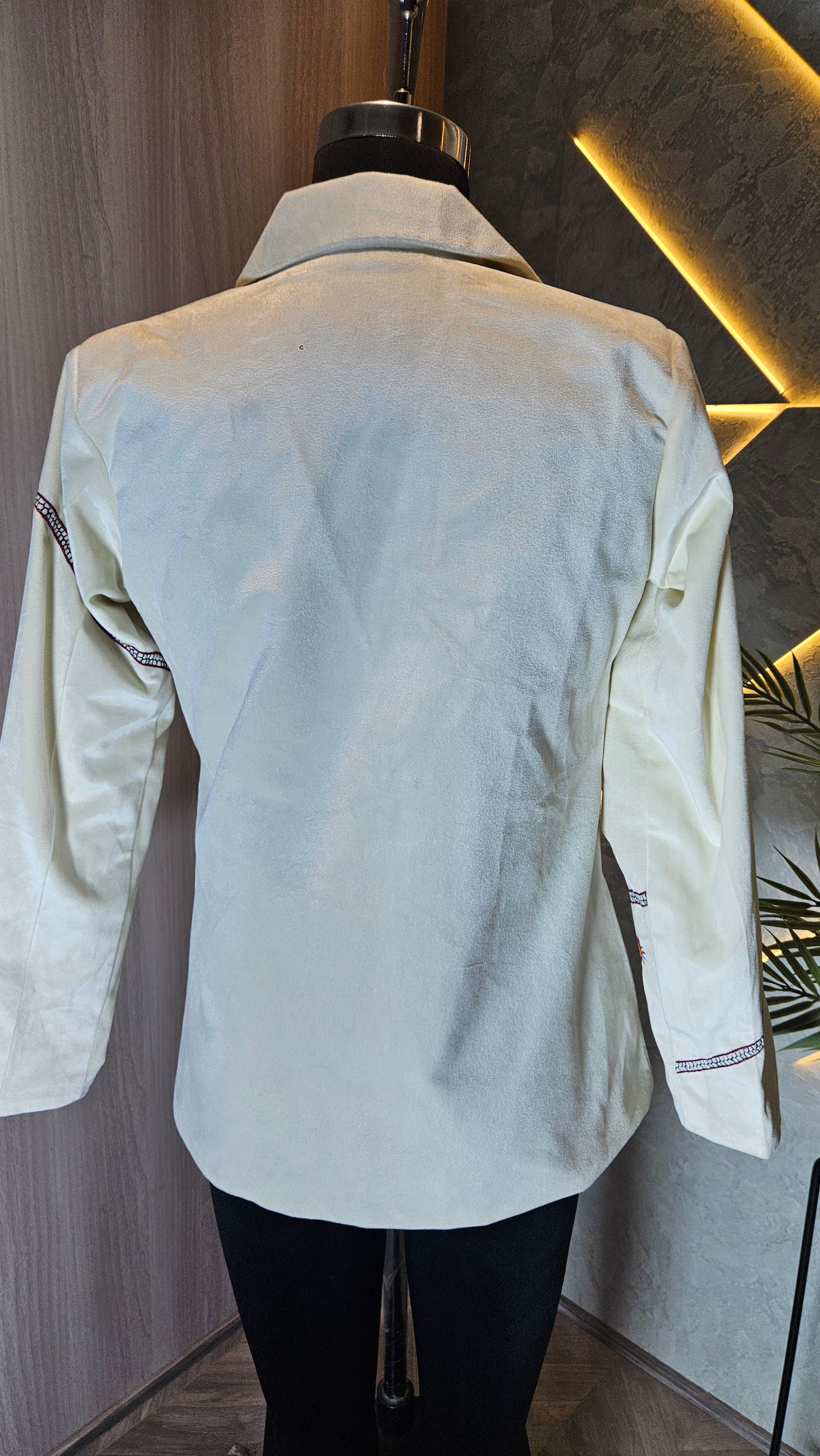 Bring artisanal elegance to your collection with this handcrafted women's shirt, made from a premium cotton blend for all-day comfort. Featuring intricate tribal-inspired embroidery in vibrant hues of orange, red, and black, this cream-colored shirt showcases a unique asymmetrical embroidered panel and scattered motif design for a standout appeal.