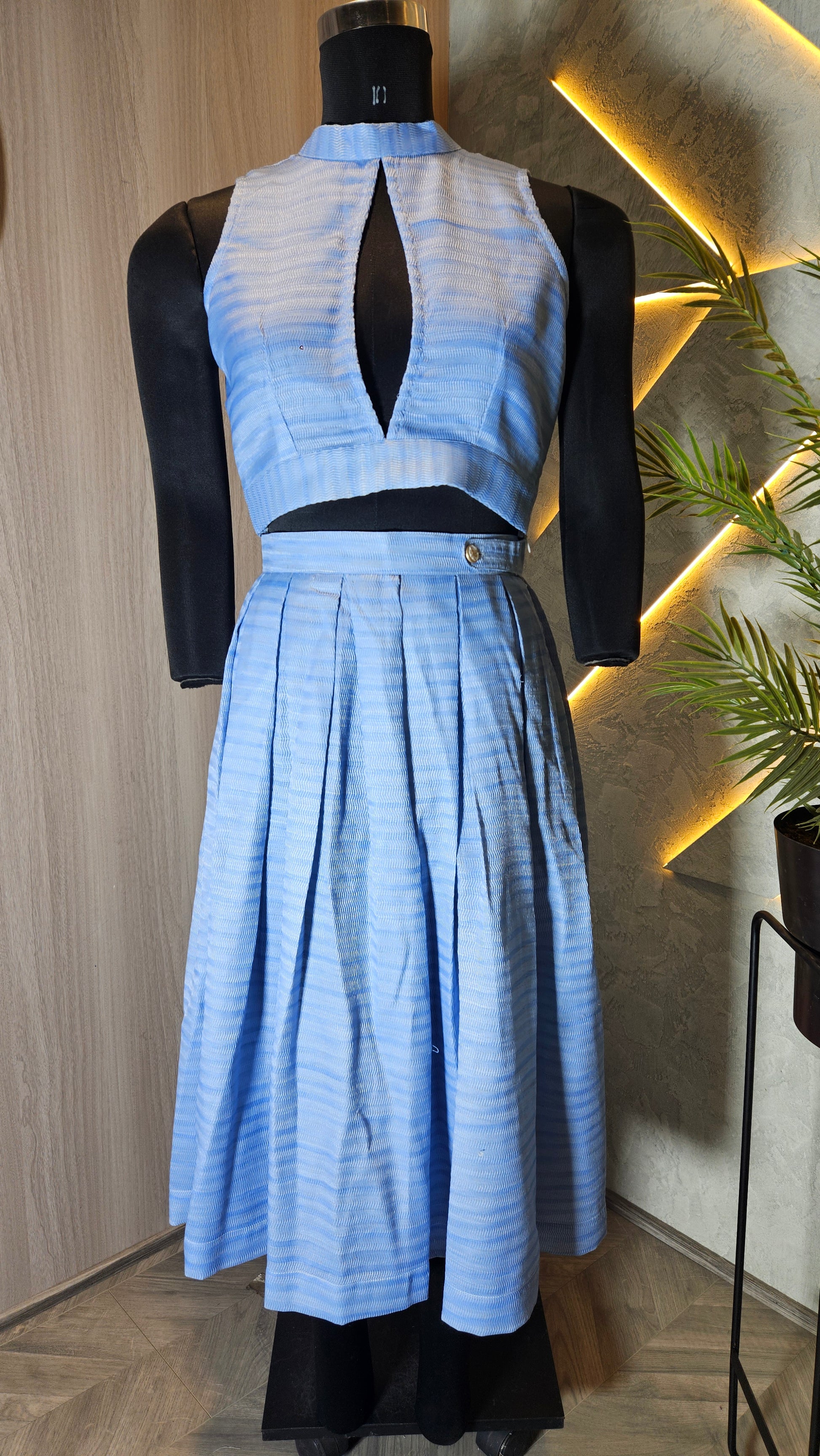Elevate your wardrobe with our Skyline Pleated Co-Ord Set, a chic and contemporary ensemble perfect for casual outings, summer events, or vacation wear. Made in India, this stylish set includes a sleeveless crop top with a front keyhole detail and a high-waisted A-line pleated skirt, tailored in a breathable, textured cotton-blend fabric for all-day comfort and effortless style.