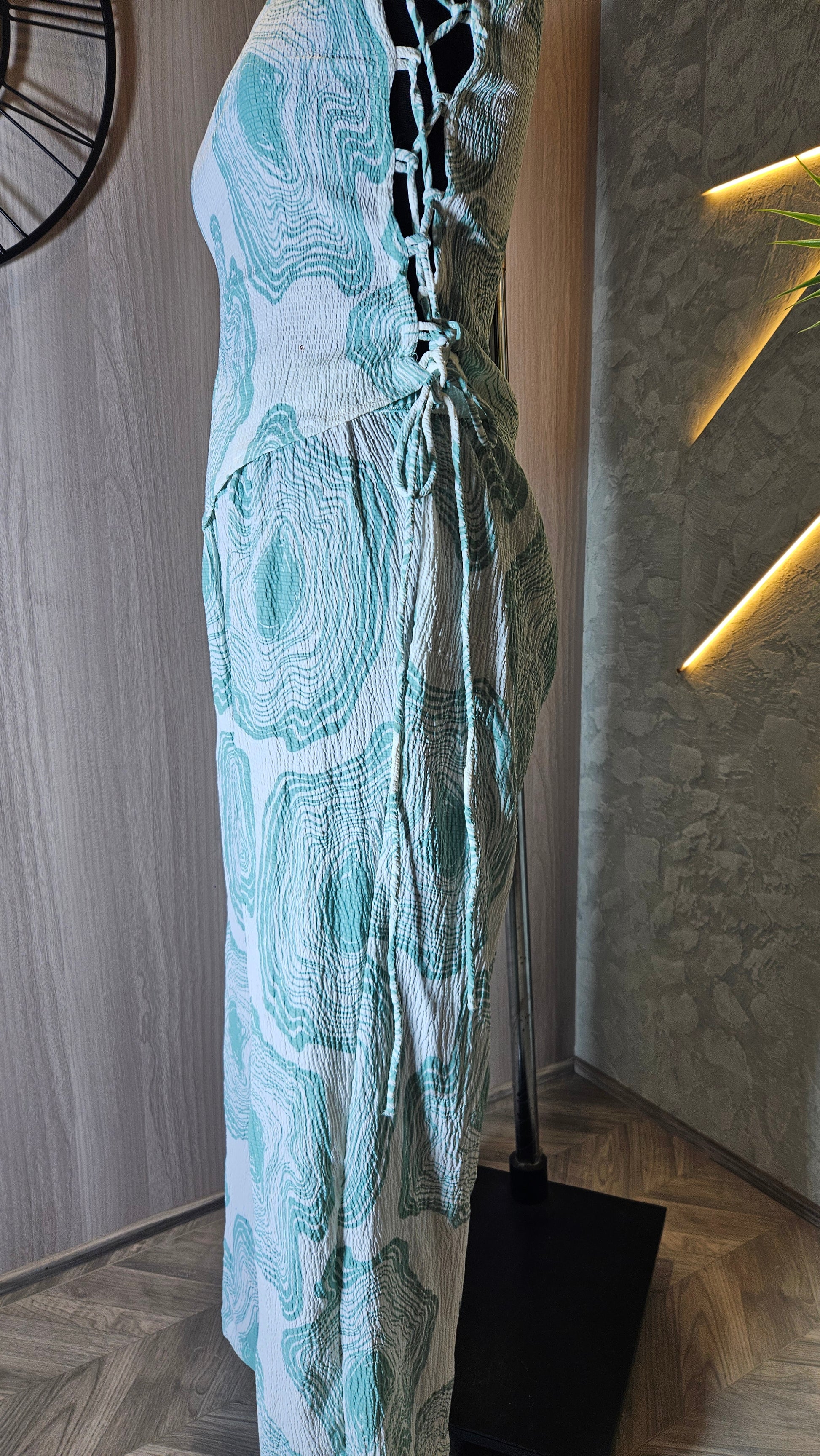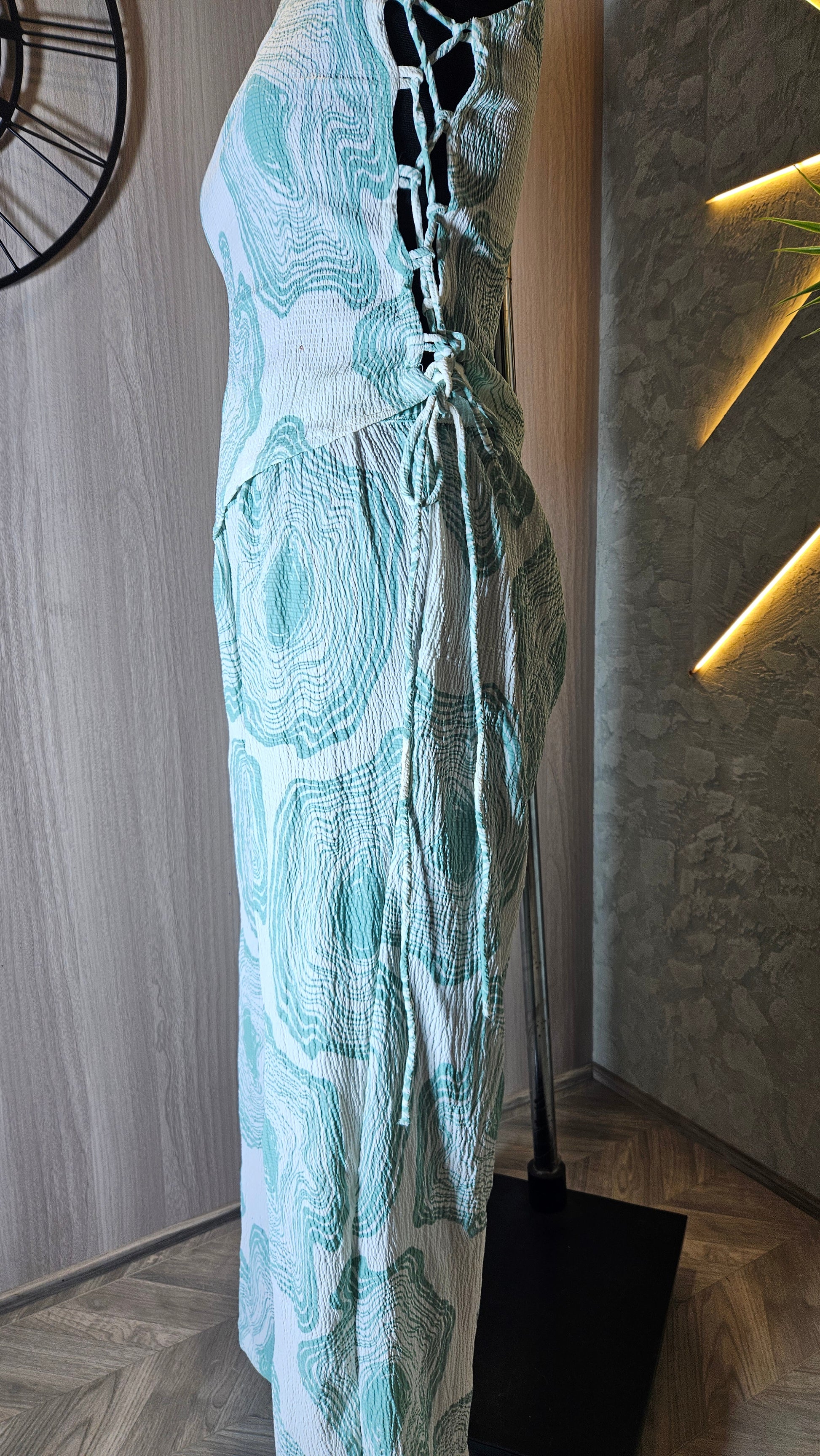 The unique aqua marble swirl print over a soft white base gives it a modern, artistic touch – perfect for summer outings, beachwear, resort fashion, or casual evenings. The wide-leg palazzo fit ensures freedom of movement and a flattering silhouette for all body types.