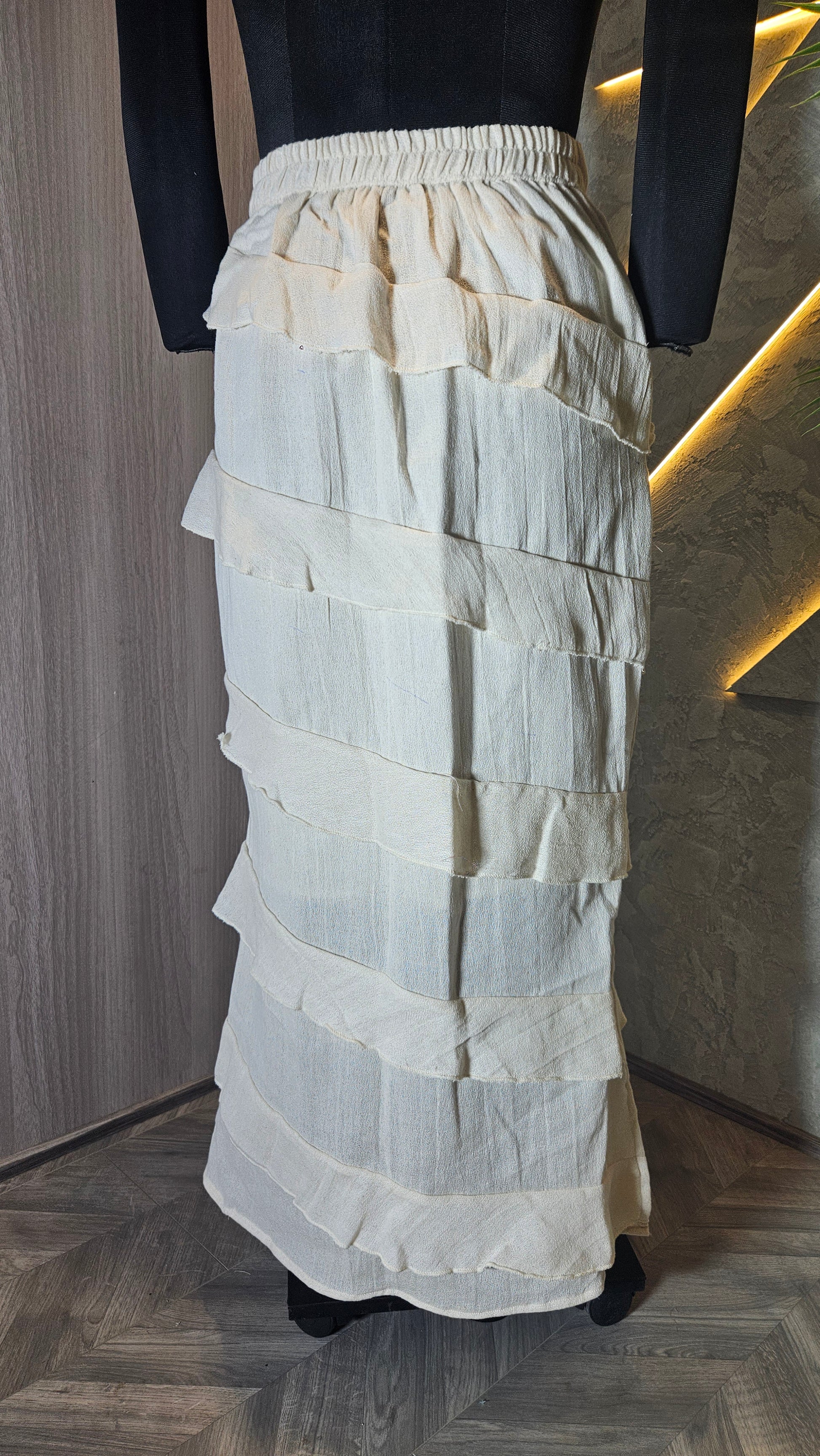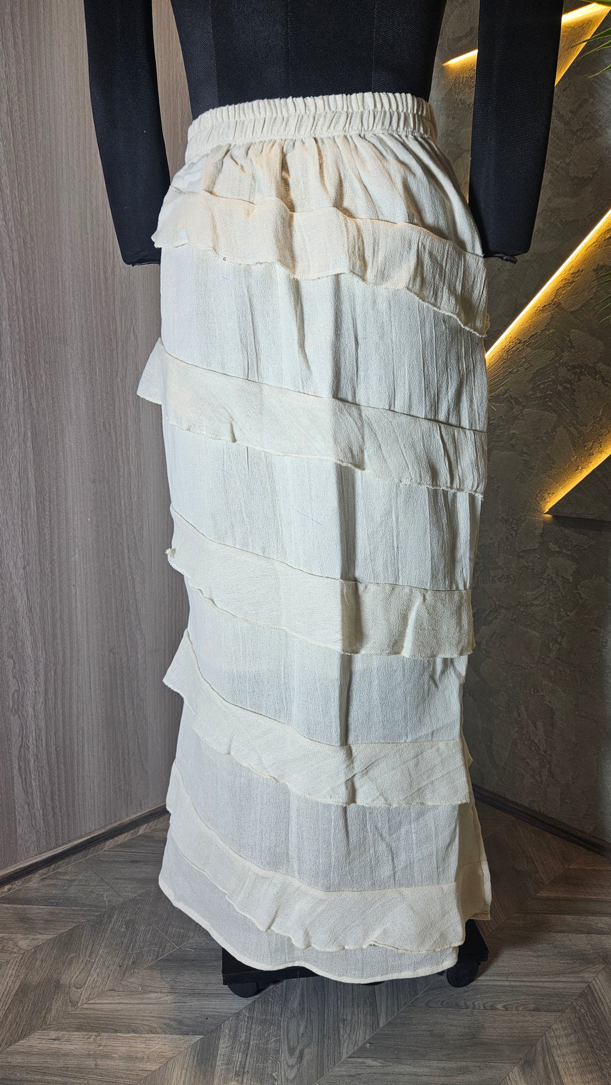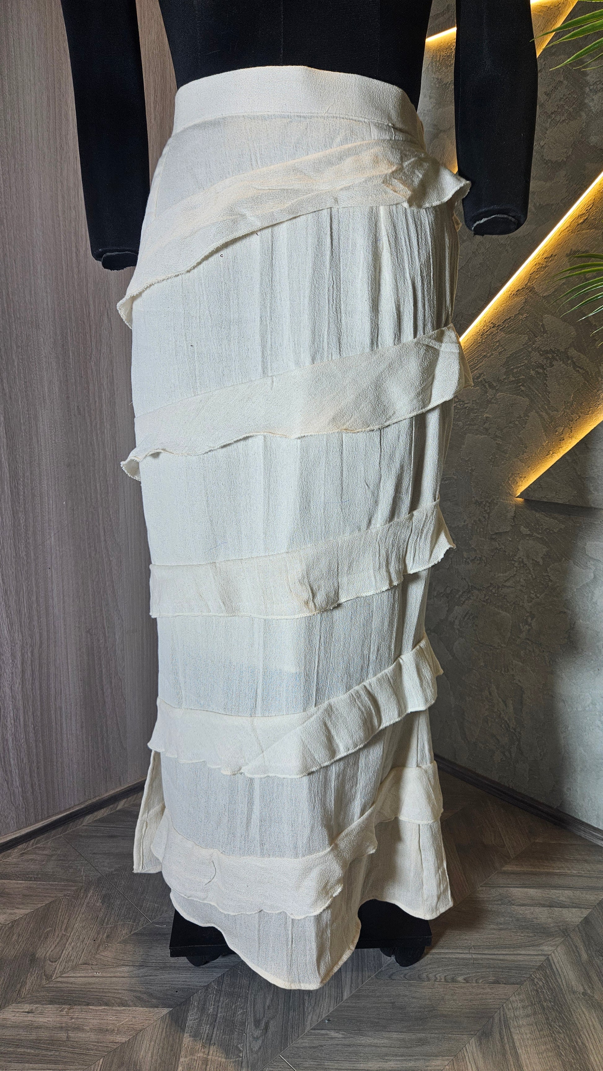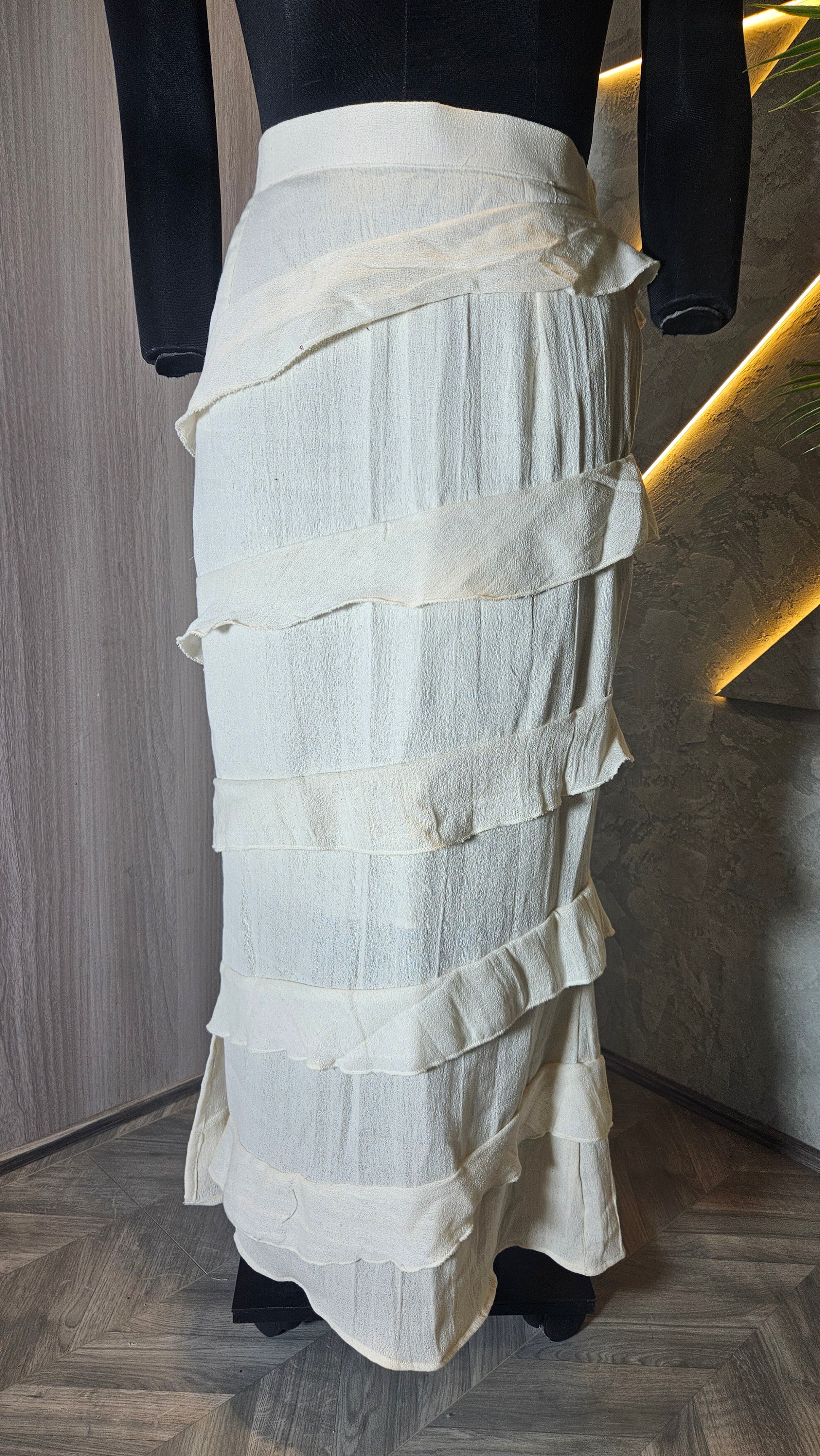 Ideal for summer, beachwear, resort collections, or casual chic looks, the skirt showcases Indian craftsmanship with a contemporary twist. The breathable fabric and flowy silhouette make it suitable for all-day wear, while the raw-edge detailing on the layers adds a rustic, artisanal finish.