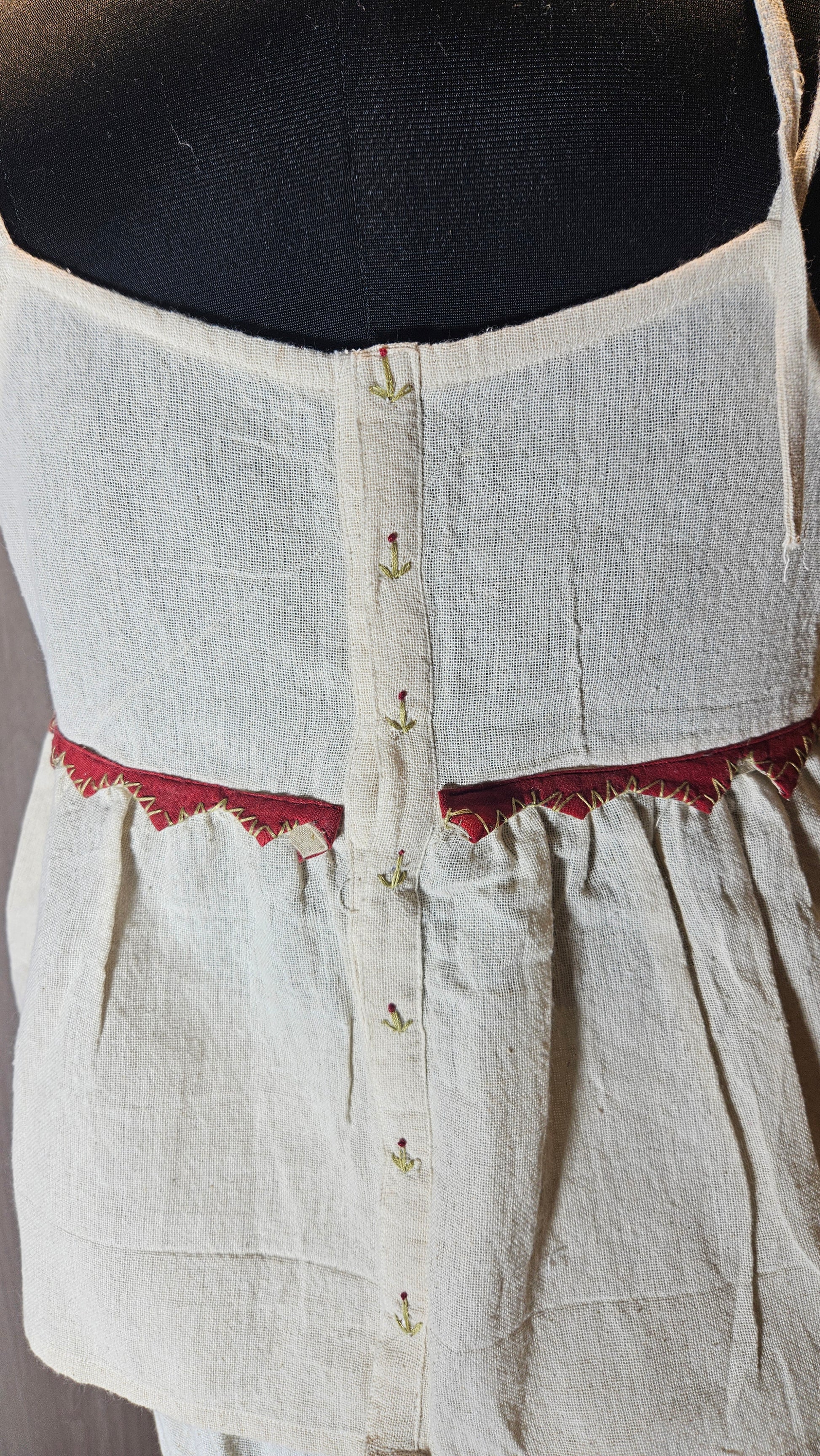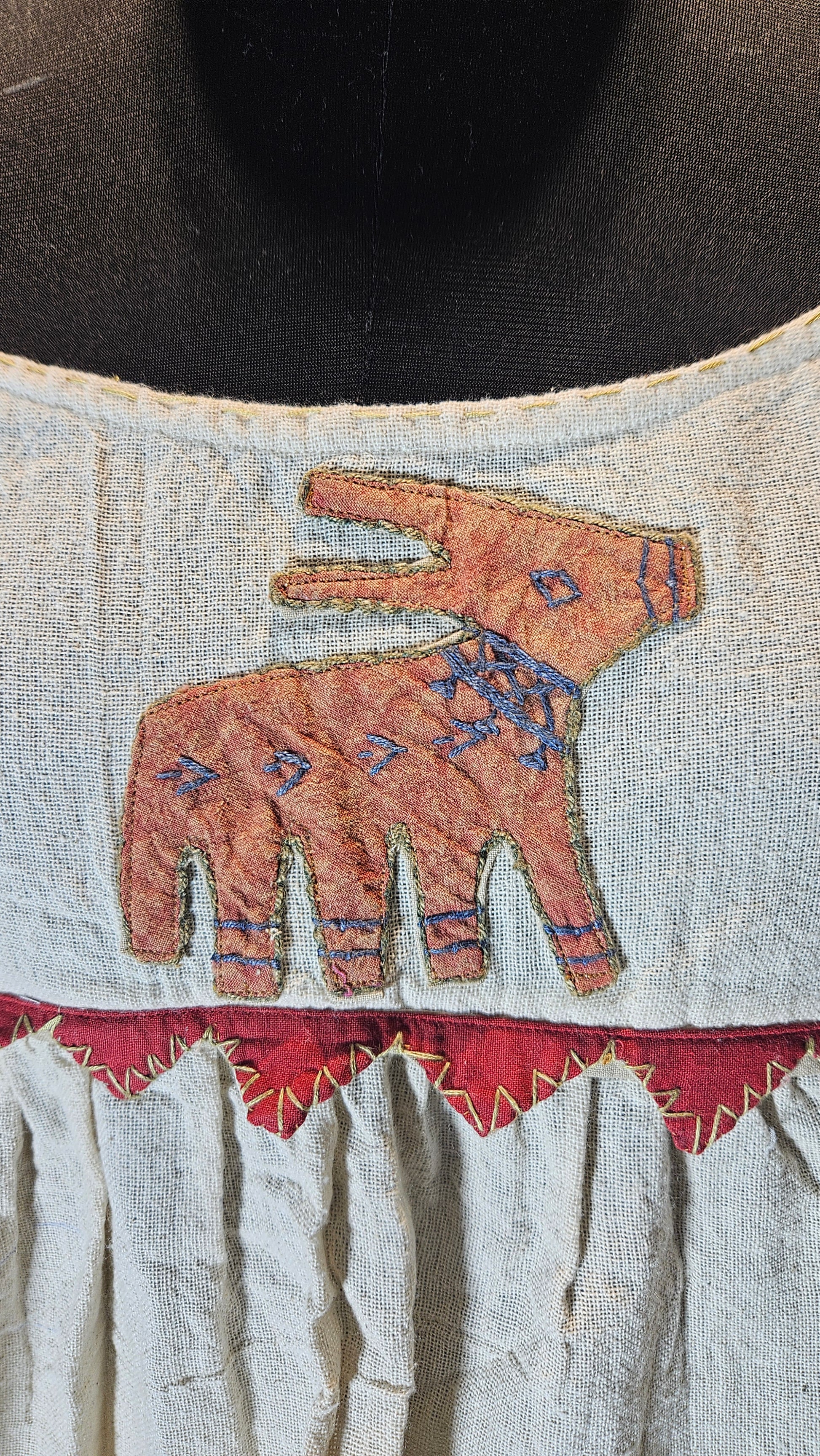 The front is adorned with a hand-appliquéd tribal animal motif and decorative stitching, highlighting India’s rich tradition of folk embroidery and artisanal work. The gathered waistline with contrast detailing adds a touch of elegance while keeping the look casual and breezy.
