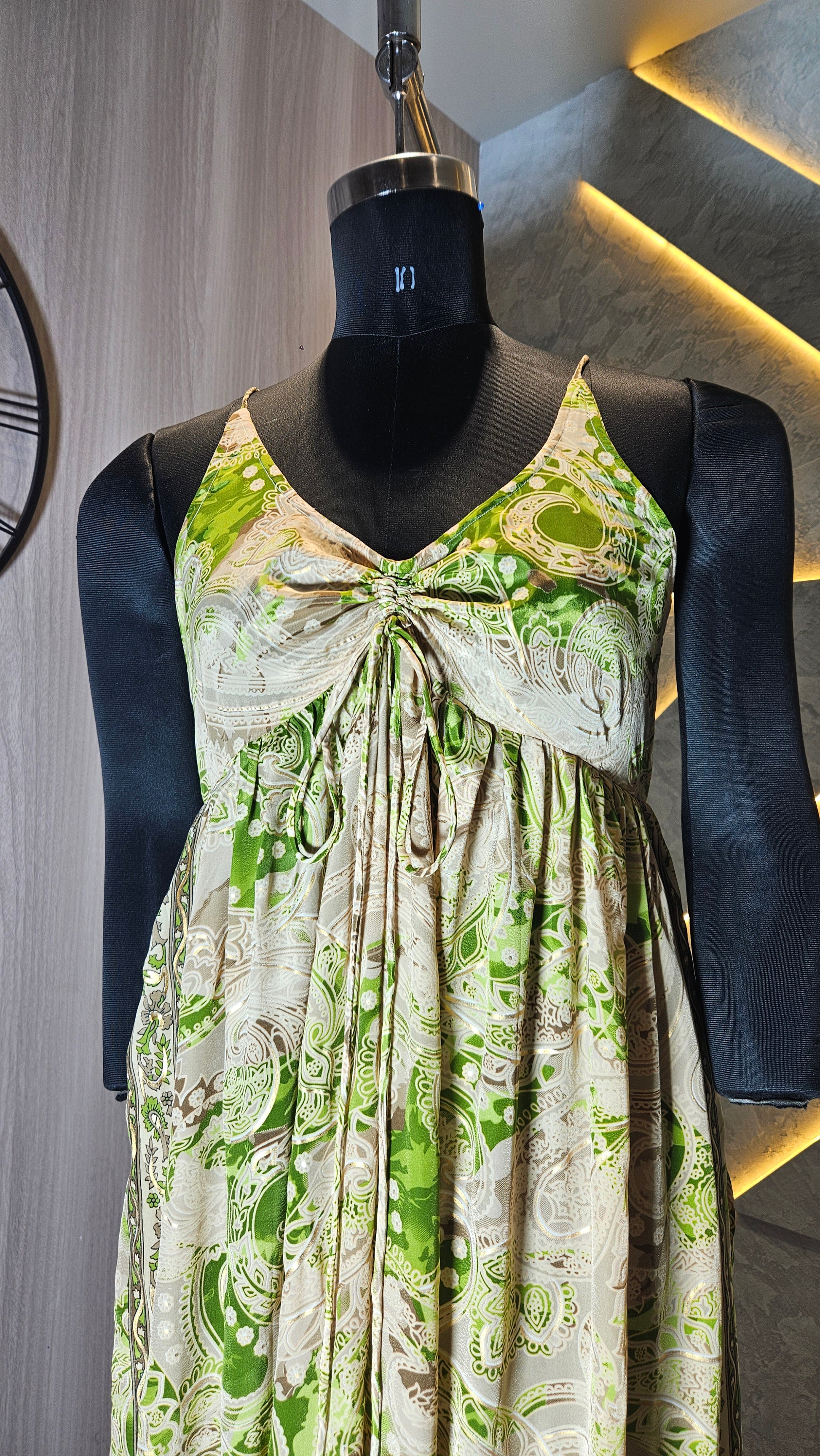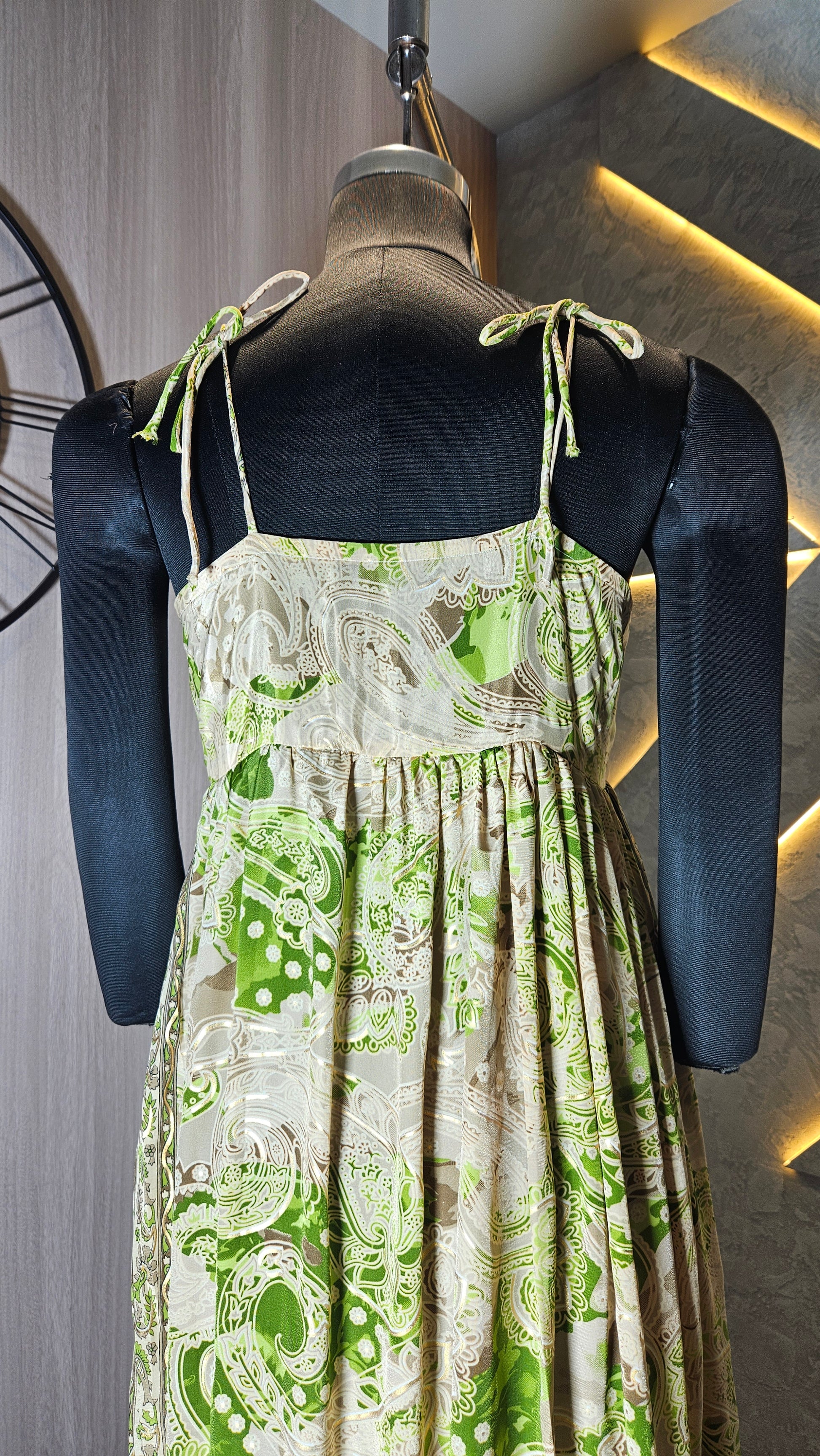 Elevate your summer wardrobe with our Boho Chic Printed Maxi Dress, a perfect blend of traditional Indian artistry and contemporary fashion. This sleeveless, floor-length dress features an elegant paisley print in soothing green and beige tones, made from lightweight and breathable fabric—ideal for warm climates. The dress showcases a gathered bust detail with a front tie, adding a feminine touch to its flowy silhouette.