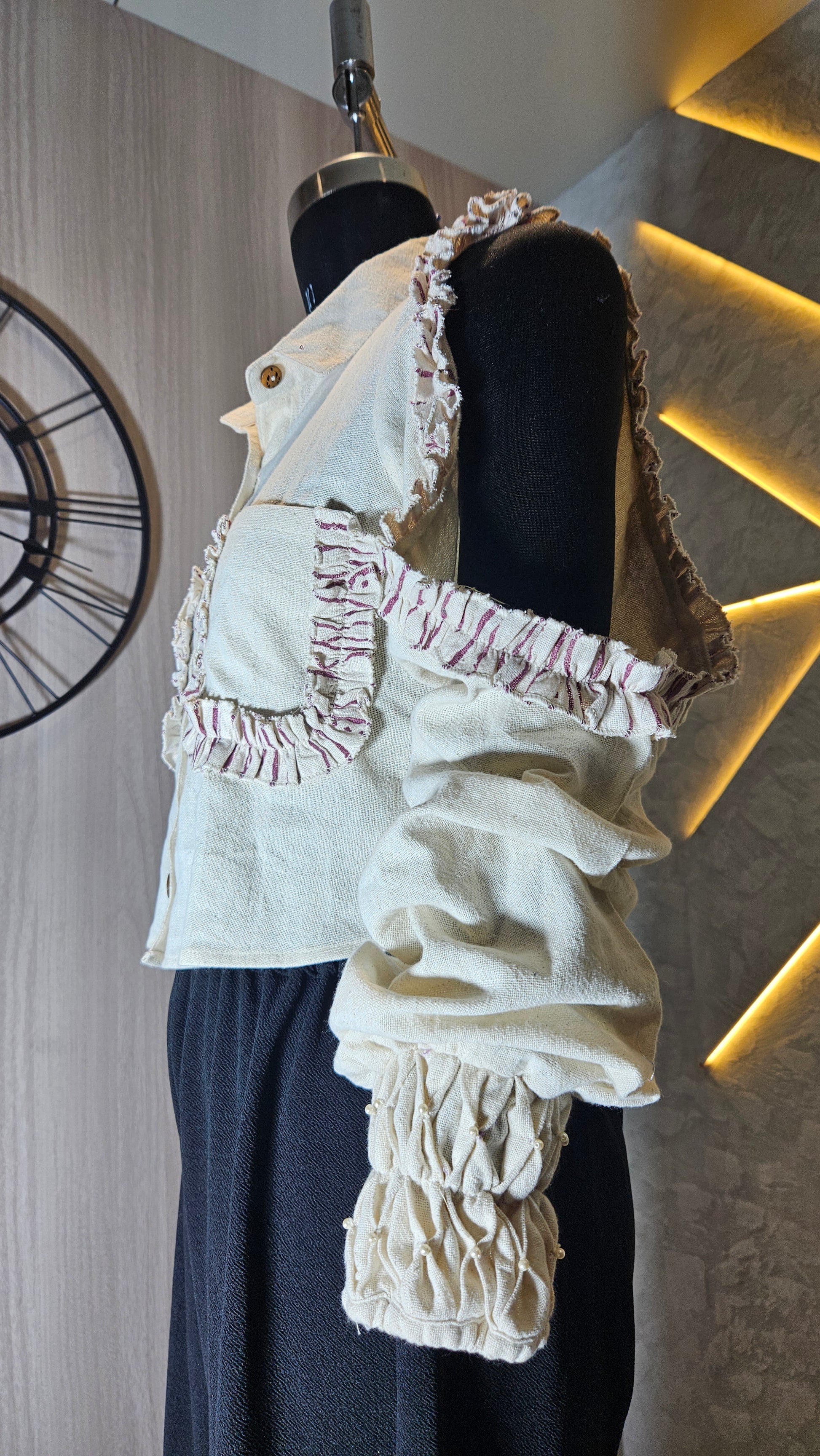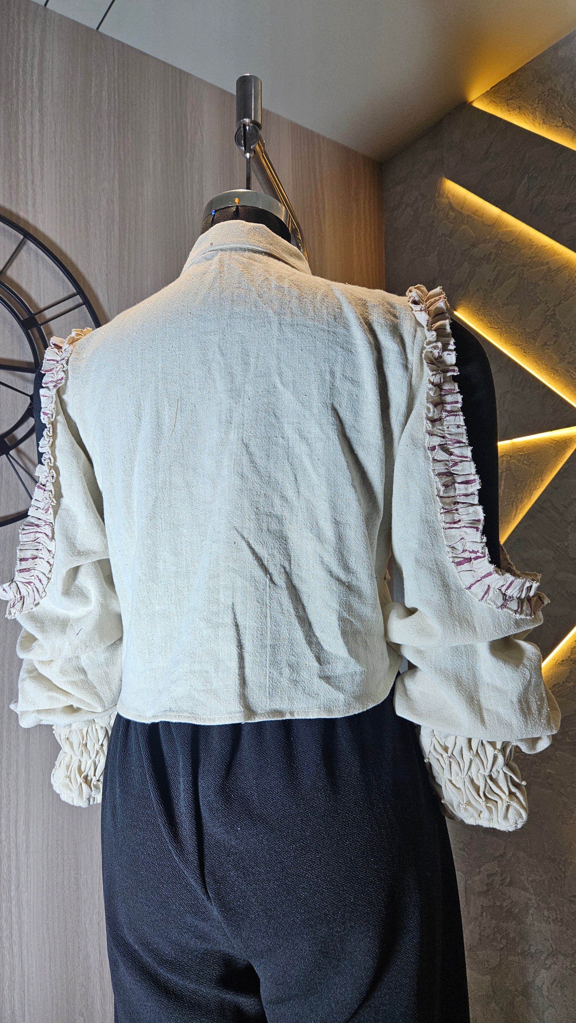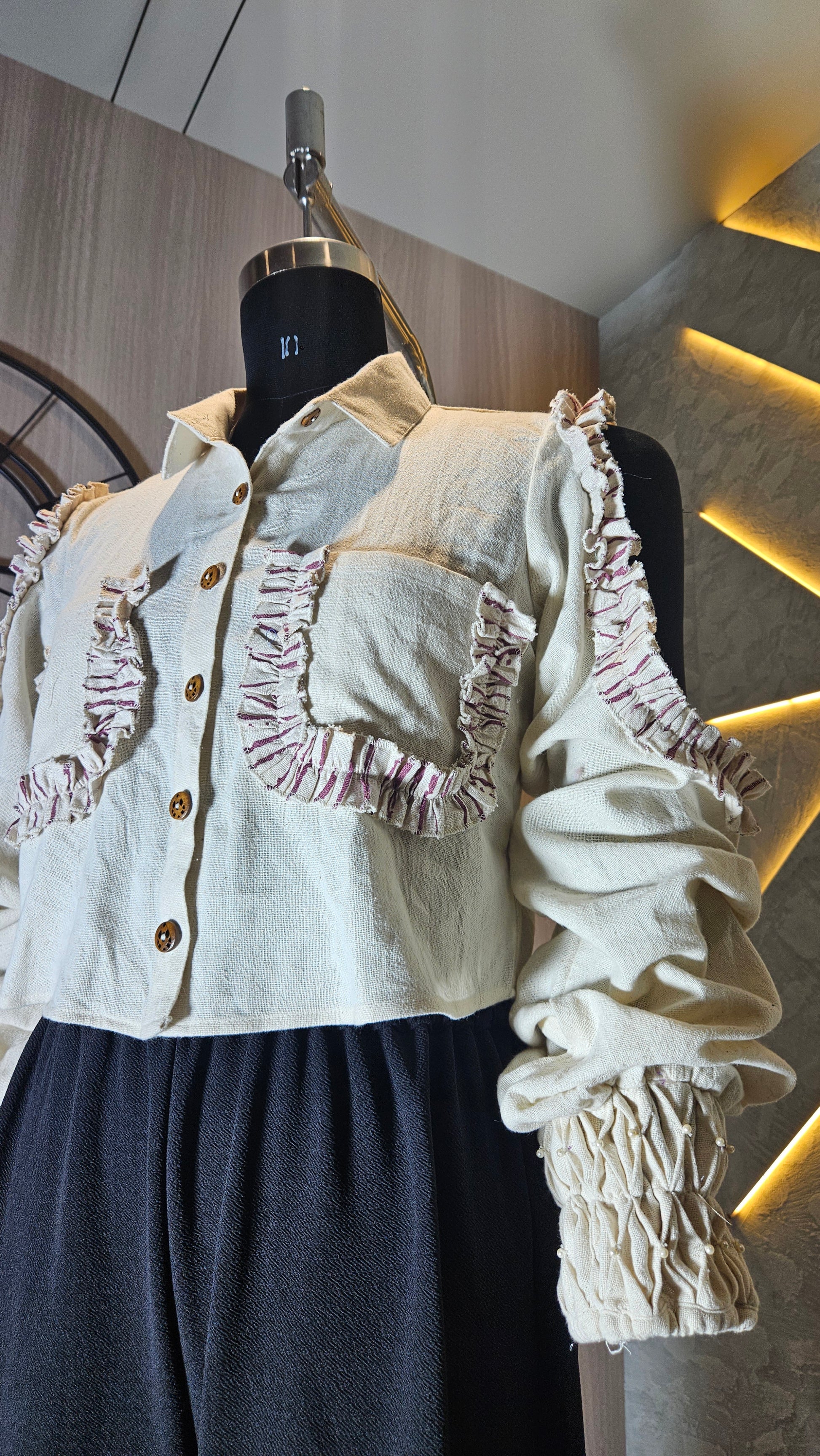 Elevate your wardrobe with this stylish and unique crop top featuring intricate ruffled detailing along the pockets and sleeves. Crafted from high-quality, breathable fabric, this top offers both comfort and flair. The front button-down design with natural wooden buttons adds a rustic charm, while the gathered cuffs bring a touch of elegance. Perfect for casual outings, brunch dates, or layered looks, this versatile piece is a must-have for fashion-forward individuals. Available in a neutral cream shade, it pairs effortlessly with skirts, trousers, or jeans. Ideal for bulk purchase for boutiques or international markets seeking trendy and chic Indian-inspired apparel.