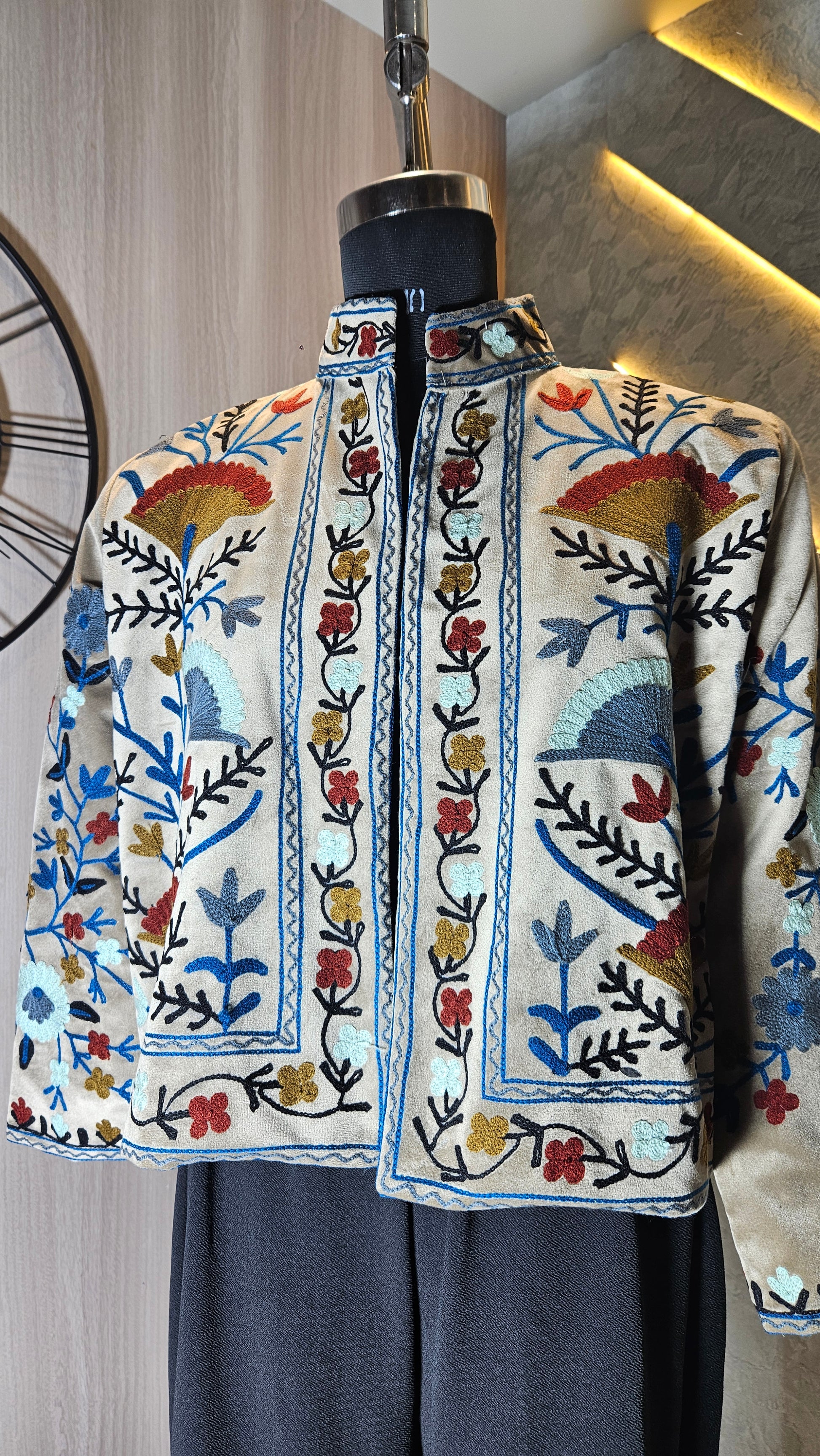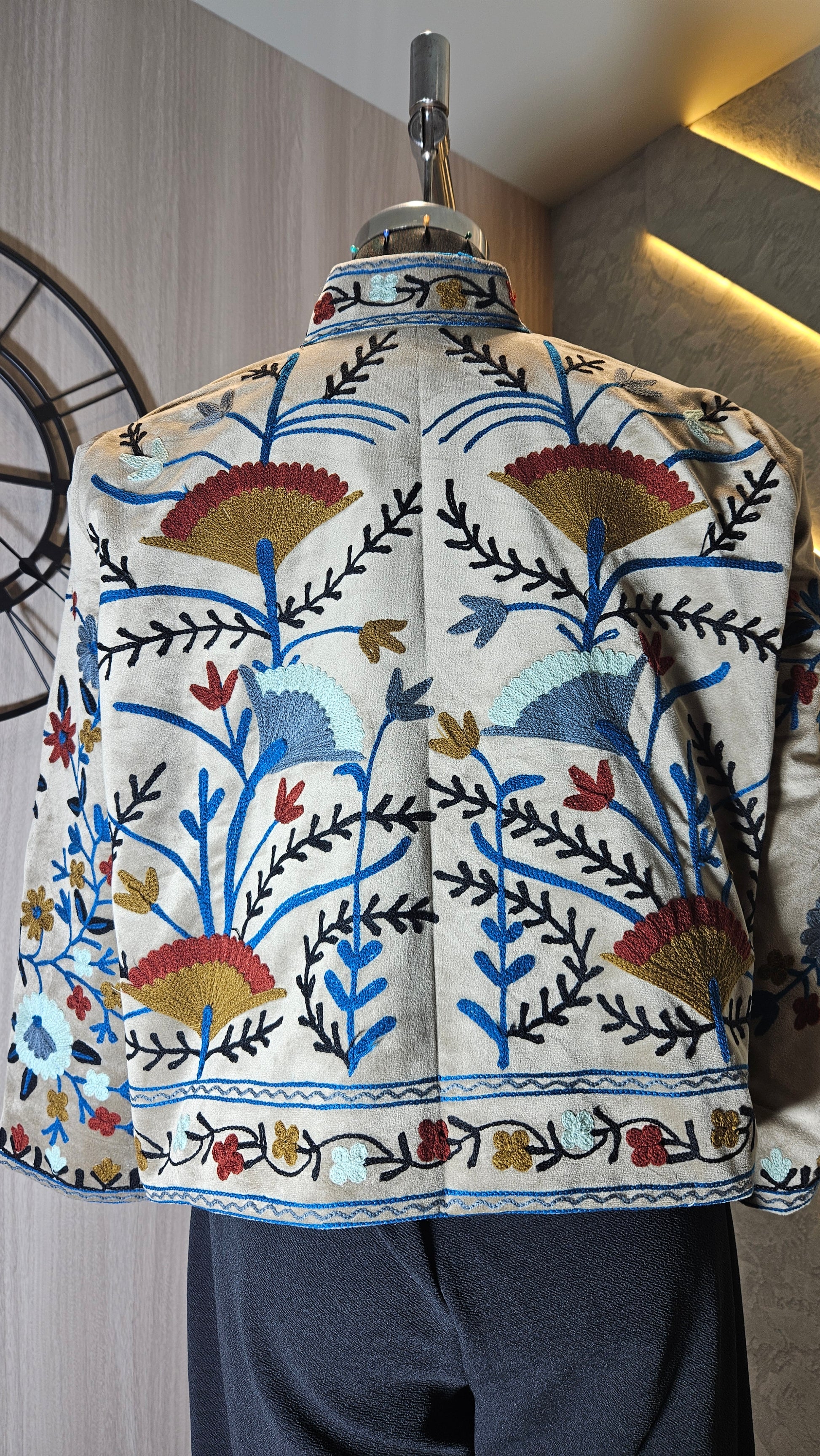 Experience the rich heritage of Indian craftsmanship with this exquisite Handcrafted Kashmiri Suede Embroidered Jacket. Made from premium-quality soft suede, this jacket features intricate floral embroidery in vibrant hues of blue, red, mustard, and cream, showcasing the traditional Kashmiri artistry. The elegant high collar and open front design make it a versatile piece that pairs effortlessly with both casual and formal wear. Perfect for adding a touch of ethnic sophistication to any wardrobe, this jacket combines comfort with timeless style. Ideal for retailers and boutiques seeking authentic Indian artisanal fashion, available for bulk orders.