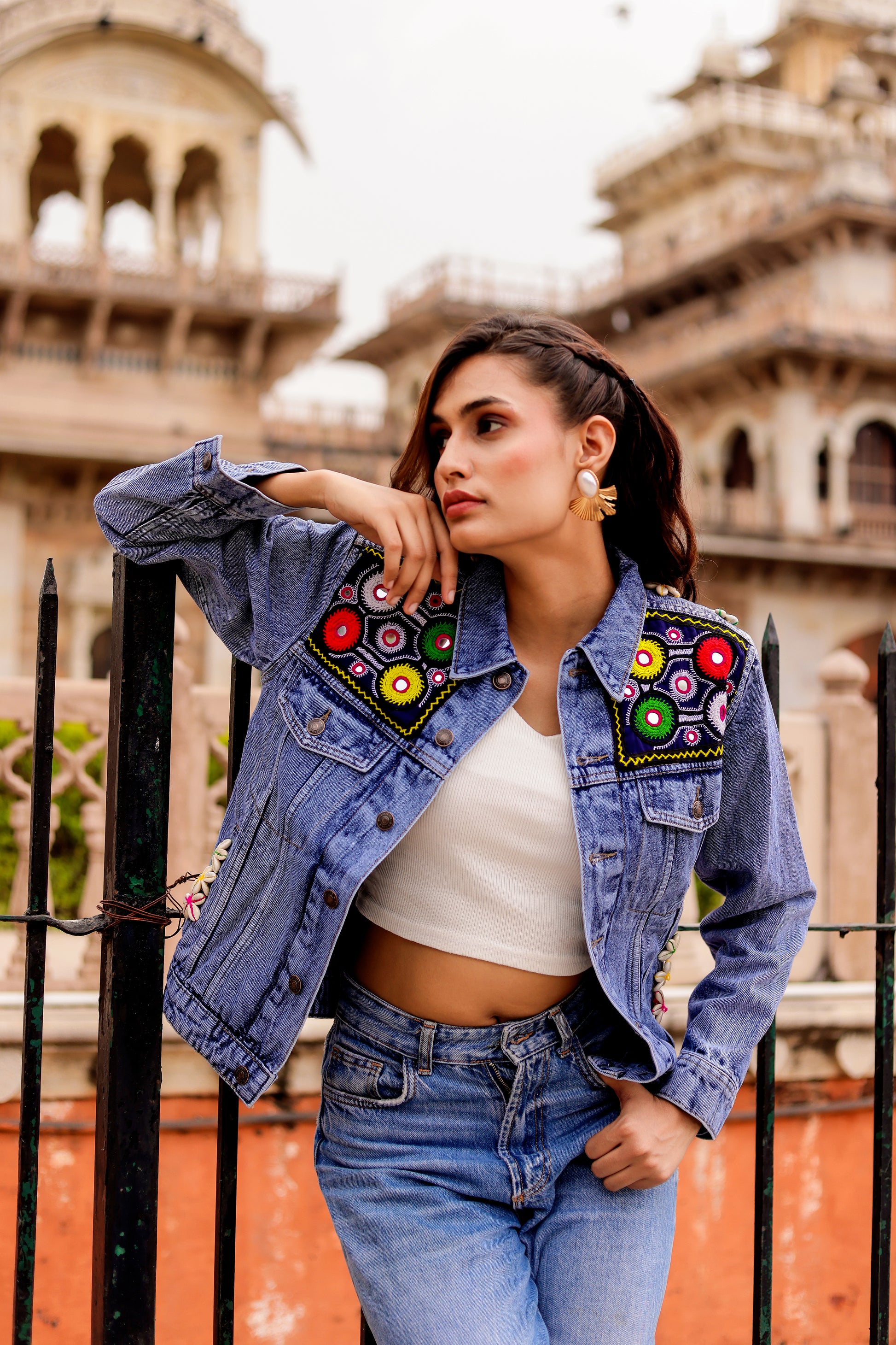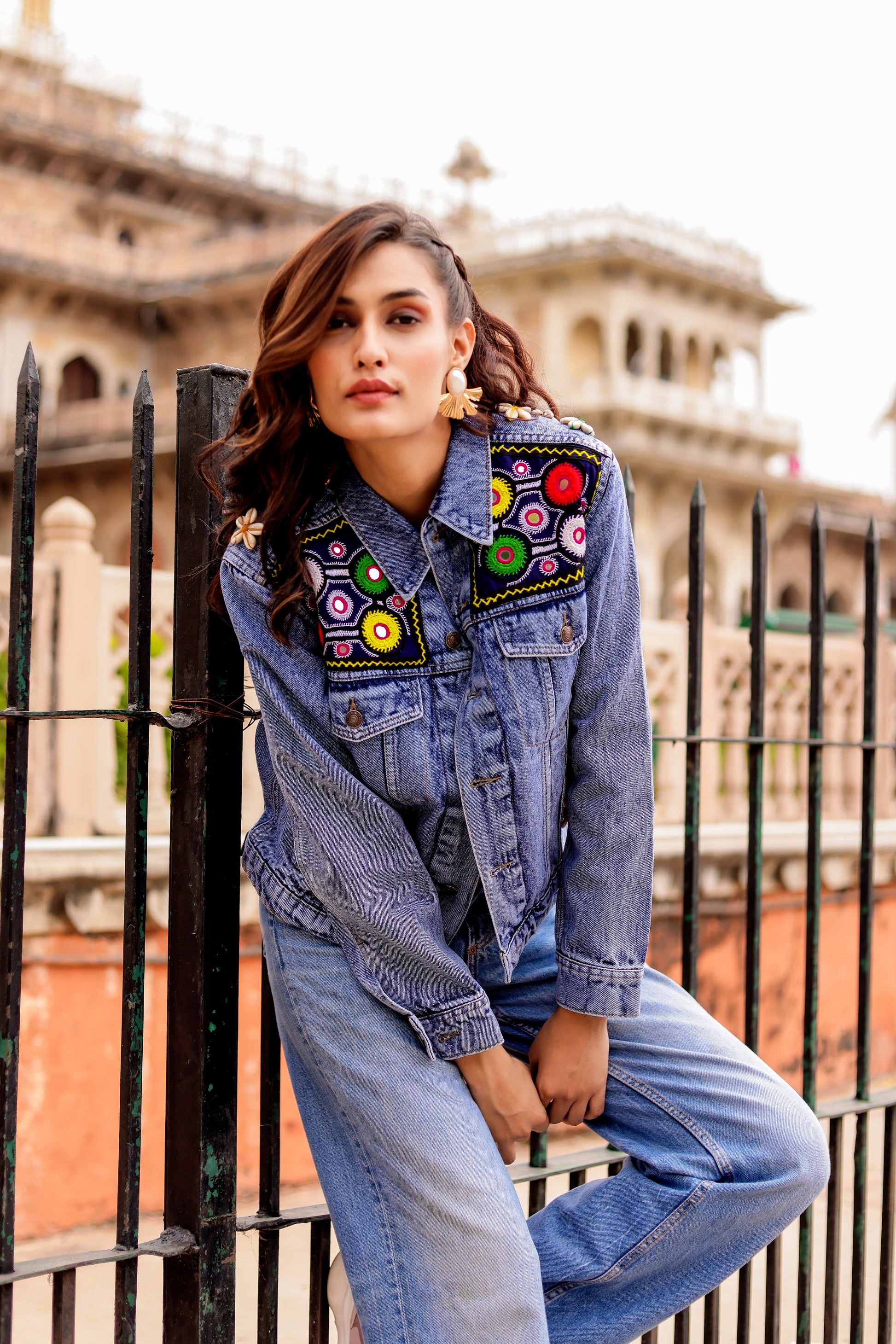 Make a bold fashion statement with our Boho Chic Embroidered Denim Jacket, a perfect blend of classic denim and vibrant Indian craftsmanship. Designed for the global woman who values both style and culture, this mid-wash denim jacket features: