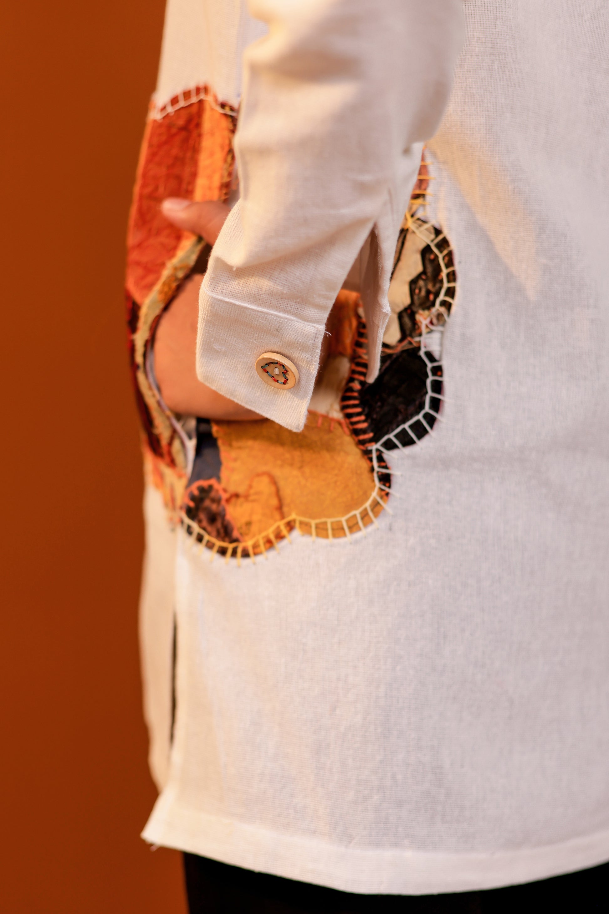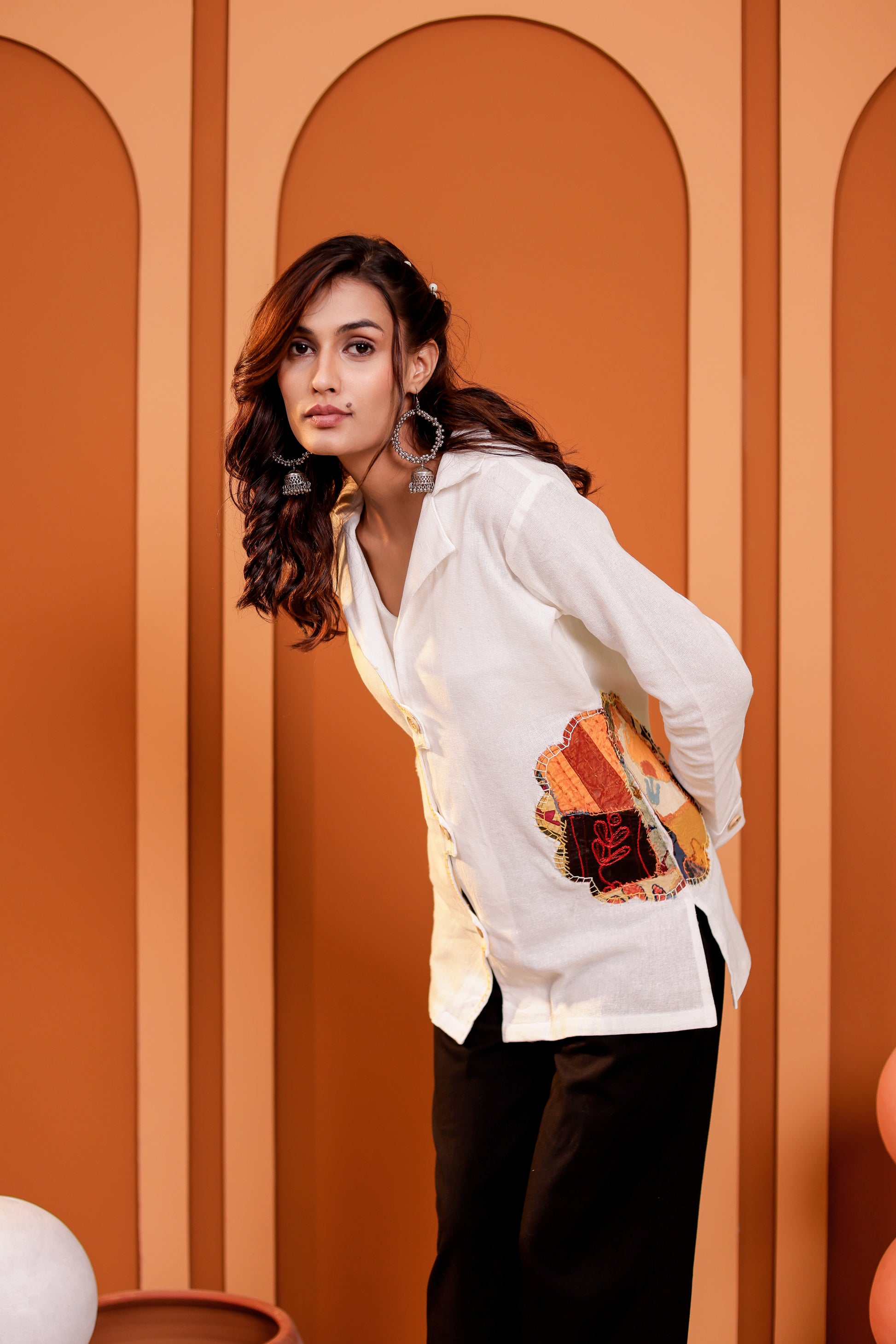 Elevate your collection with this handcrafted cotton kurti shirt, designed for the modern woman who values comfort with cultural elegance. This versatile piece blends contemporary tailoring with traditional Indian patchwork embroidery, featuring unique, vibrant patterns on both pockets. Made from breathable, high-quality cotton, the shirt offers all-day comfort, perfect for both casual and semi-formal occasions.