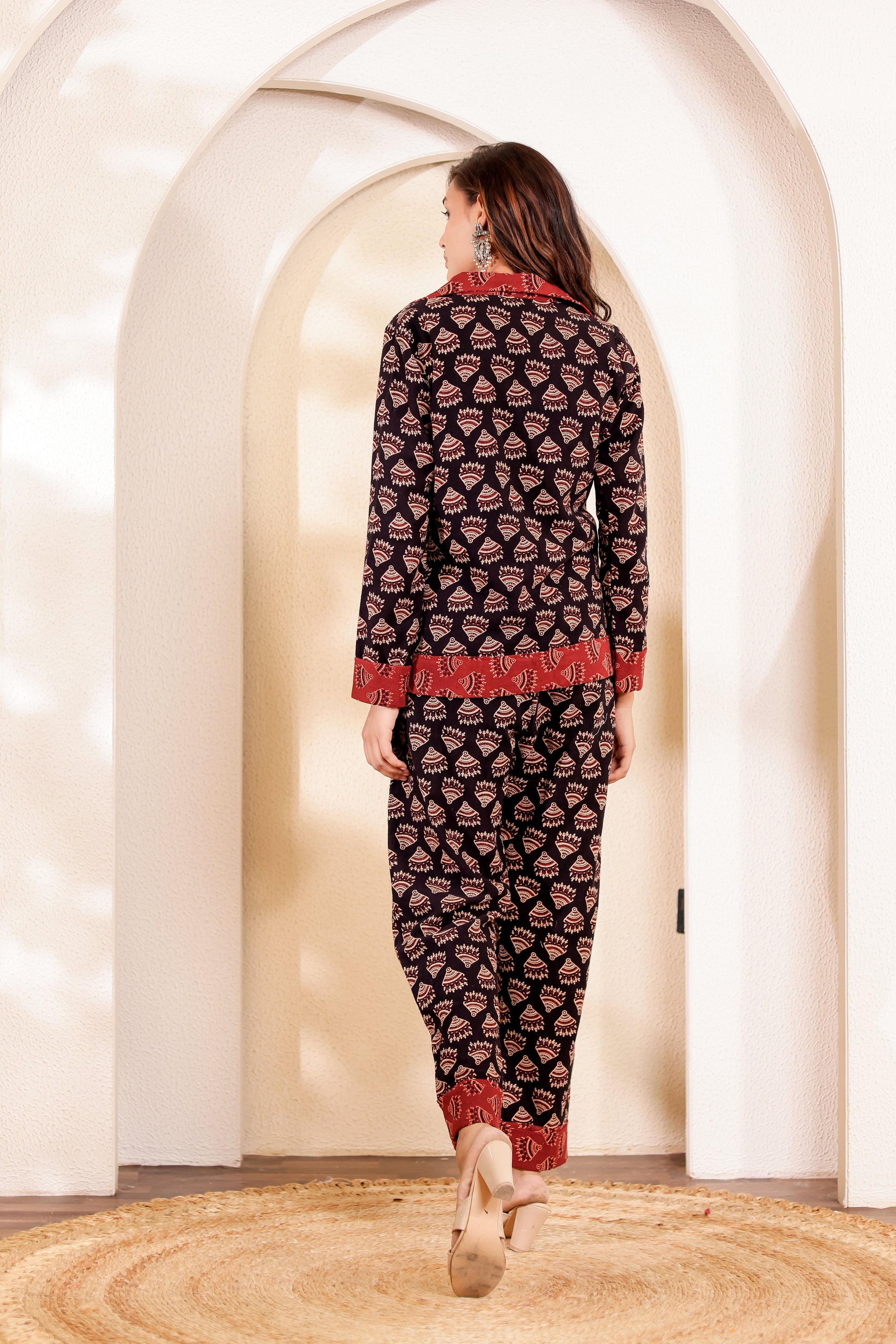 Elevate your ethnic-inspired fashion collection with our Indigo Blossom Handblock Printed Cotton Shirt, crafted with love in India. This full-sleeved shirt features intricate handblock prints in earthy tones, showcasing traditional Indian craftsmanship with a contemporary twist. The contrasting red detailing on the placket, cuffs, and hem adds a vibrant touch to the classic indigo base.