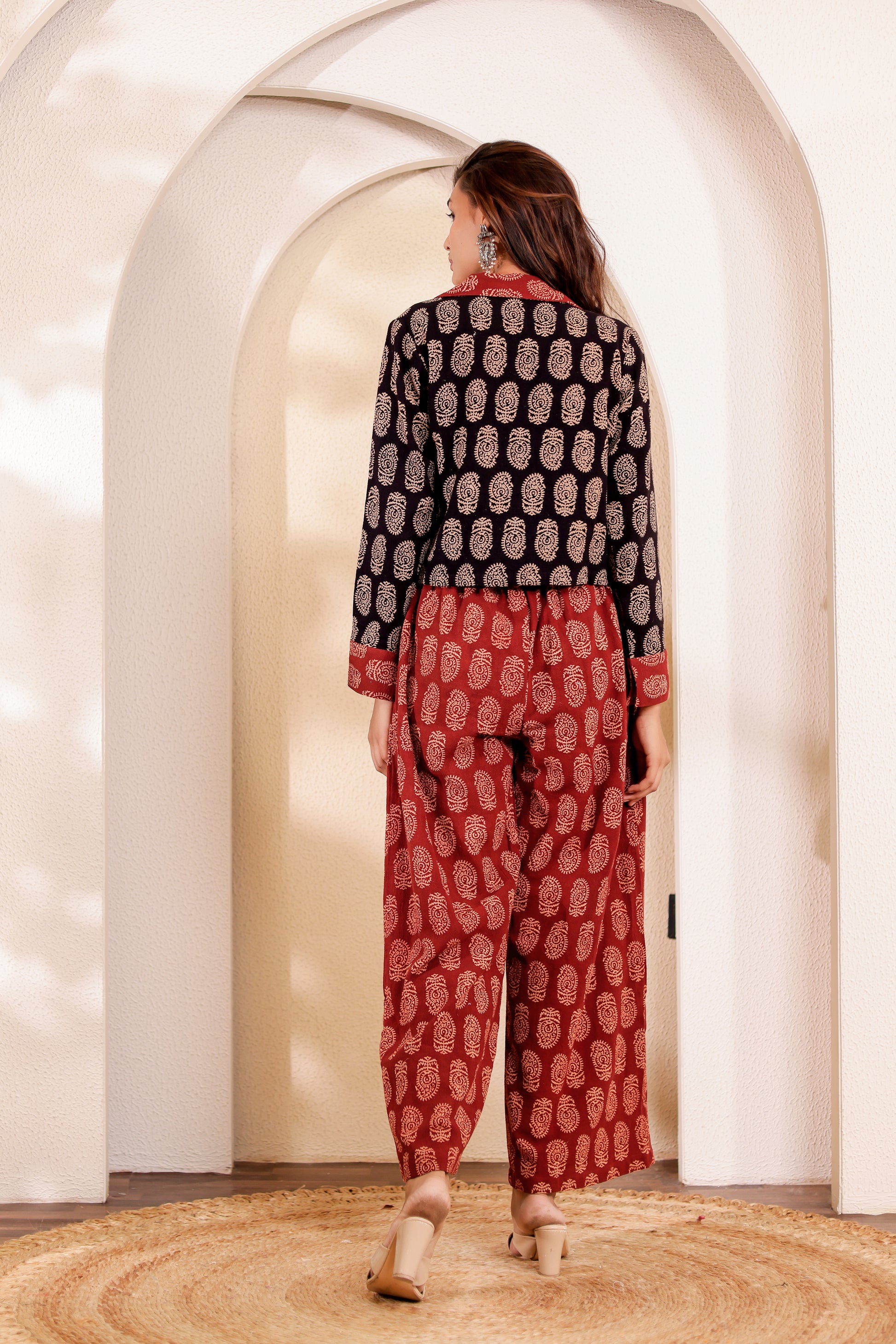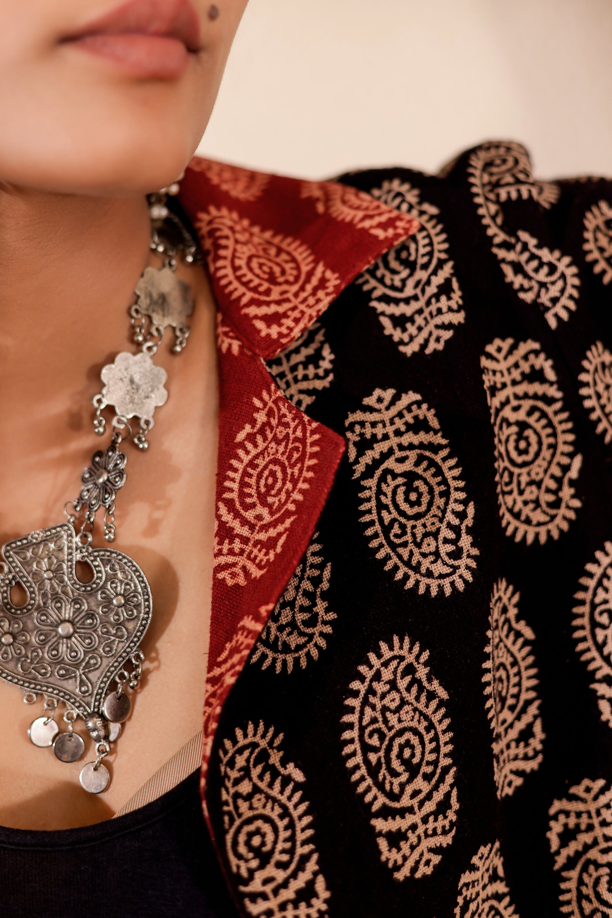 Elevate your ethnic-meets-contemporary collection with our Handblock Printed Boho-Chic Cotton Jacket. Crafted in India using traditional handblock printing techniques, this jacket features intricate paisley motifs in a rich maroon and black palette. The breathable cotton fabric ensures comfort while the modern cropped silhouette makes it a versatile piece for both casual and semi-formal wear.
