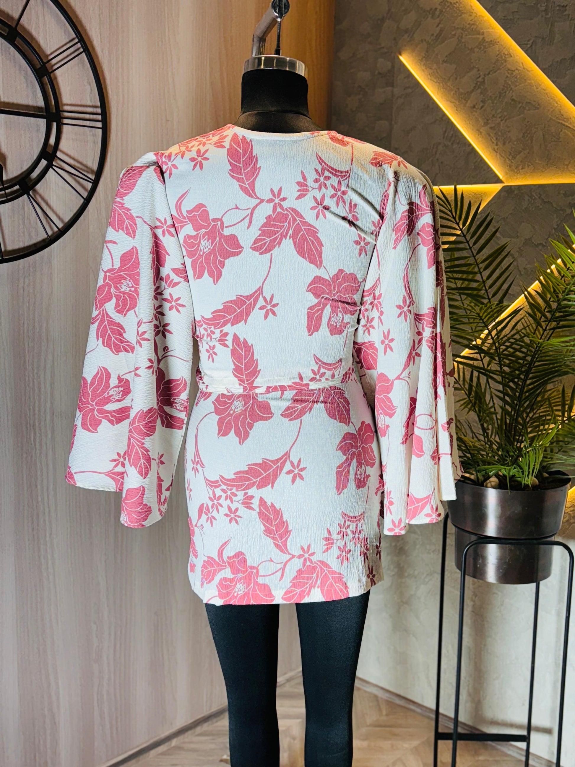 Make a bold style statement with our Boho Chic Floral Co-ord Set, perfect for summer getaways, beach vacations, or casual outings. This two-piece set features a stylish ruched crop top with drawstring detail and flared long sleeves, paired with a high-waisted mini skirt for a flattering fit. Crafted from lightweight, breathable fabric with an eye-catching pink floral print on a white base, it blends comfort with fashion effortlessly.