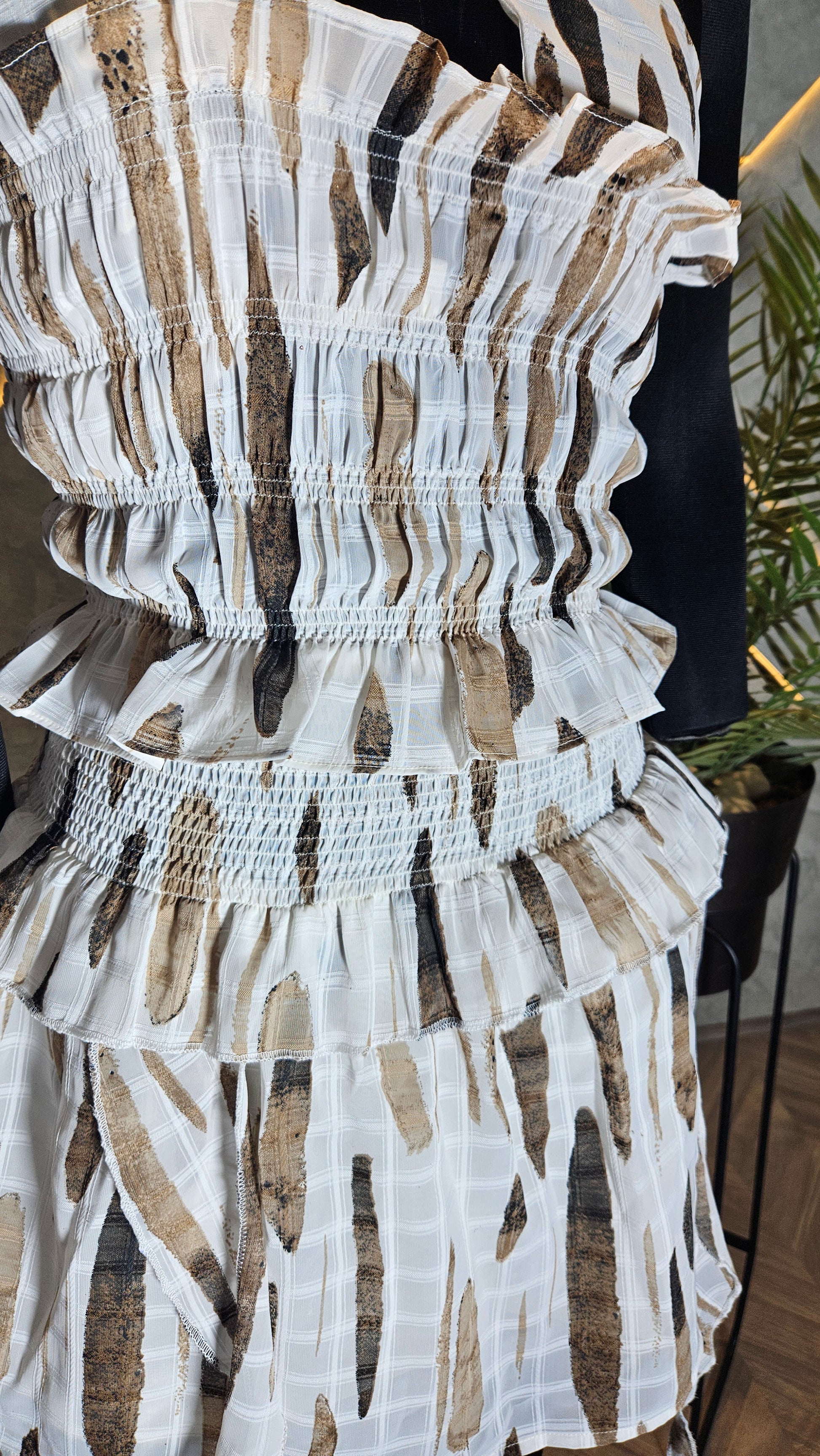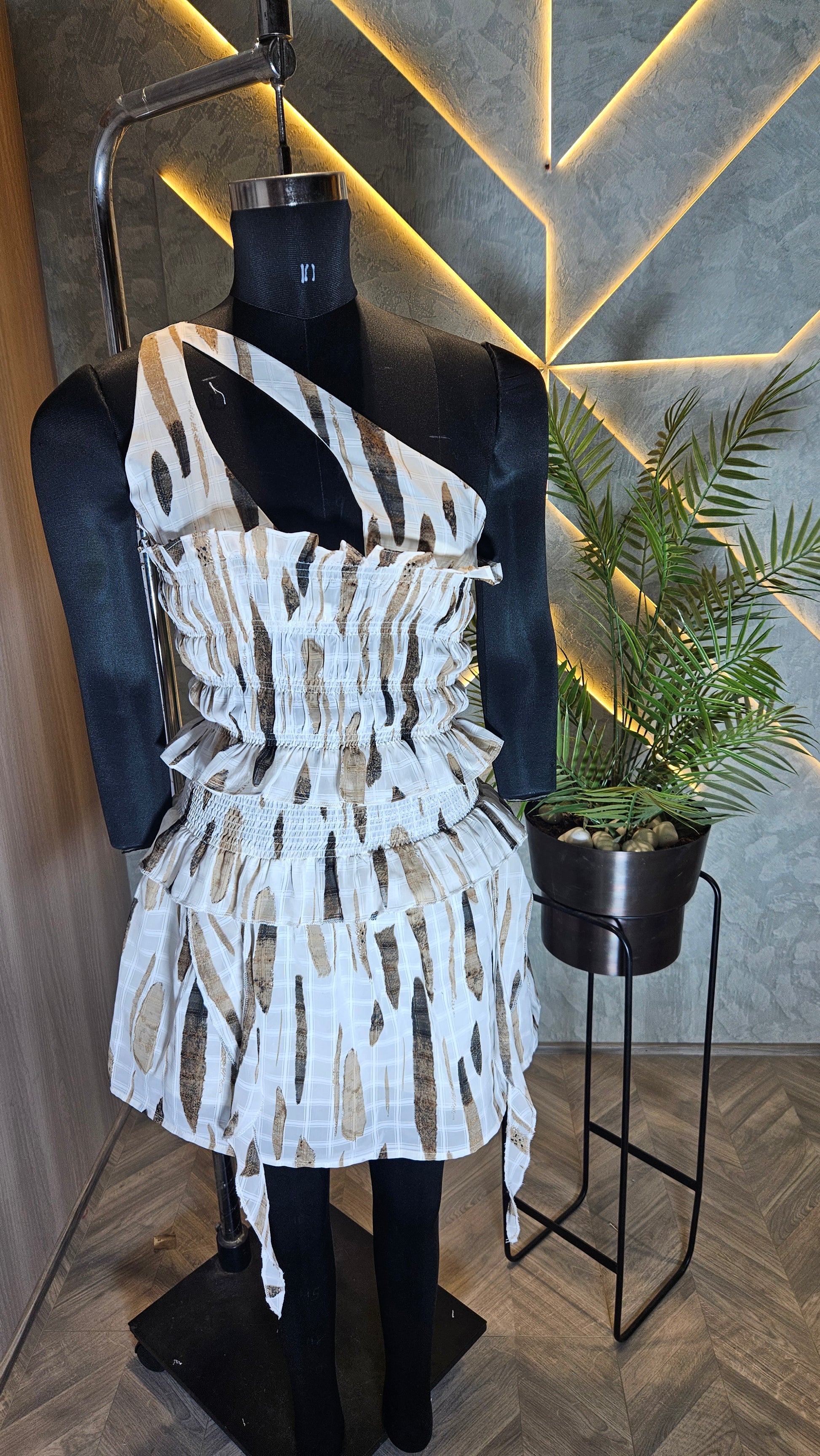 The unique tribal brushstroke print in earthy tones of black and brown on a white textured grid fabric creates a striking visual impact, perfect for resort wear, casual chic collections, or street style statements. The asymmetrical one-shoulder neckline and tiered ruffle hem add a modern twist with high-fashion appeal.