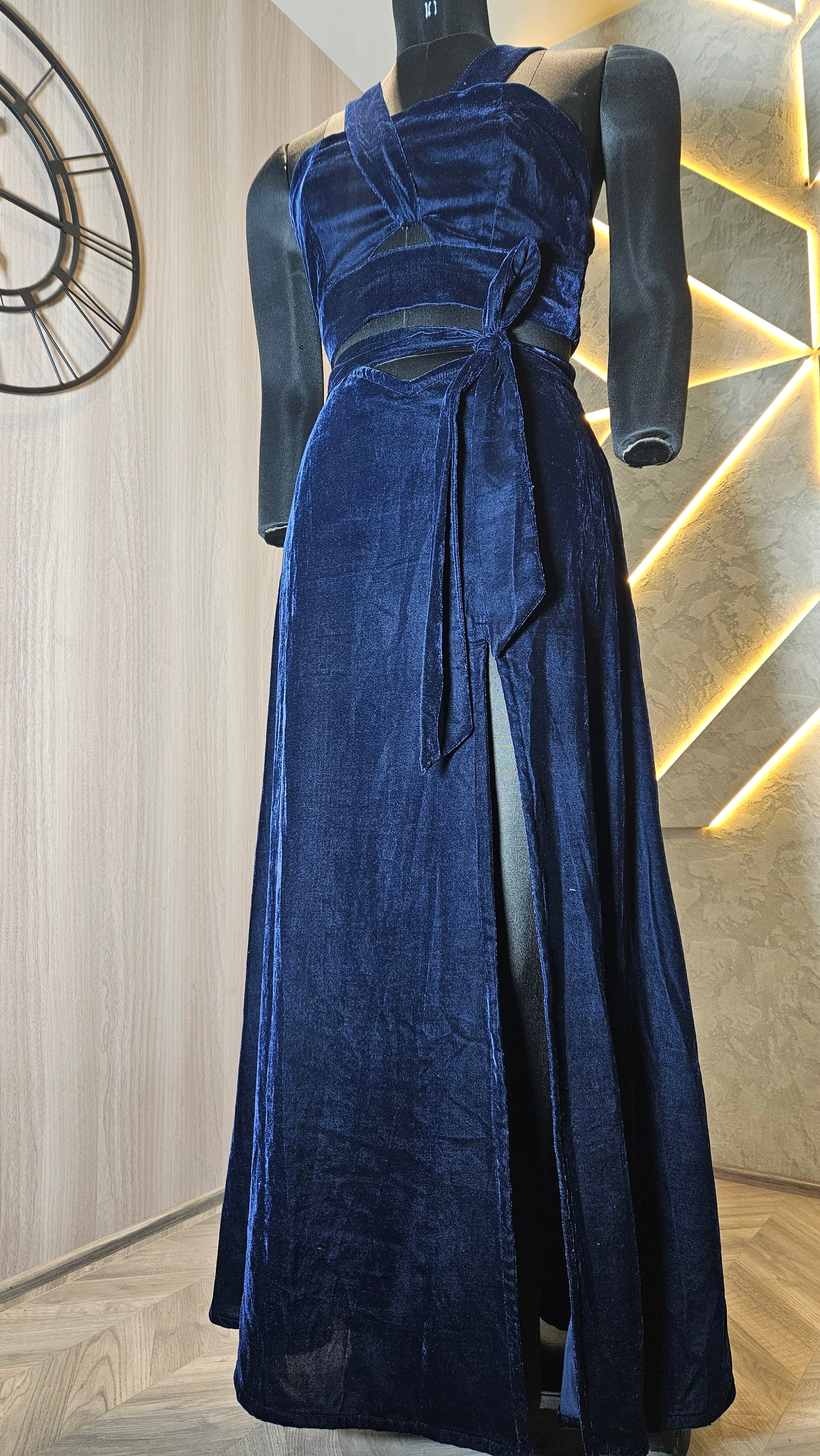 027-C-HOB Elegant Navy Blue Velvet Crop Top with High-Slit Skirt – Made in India