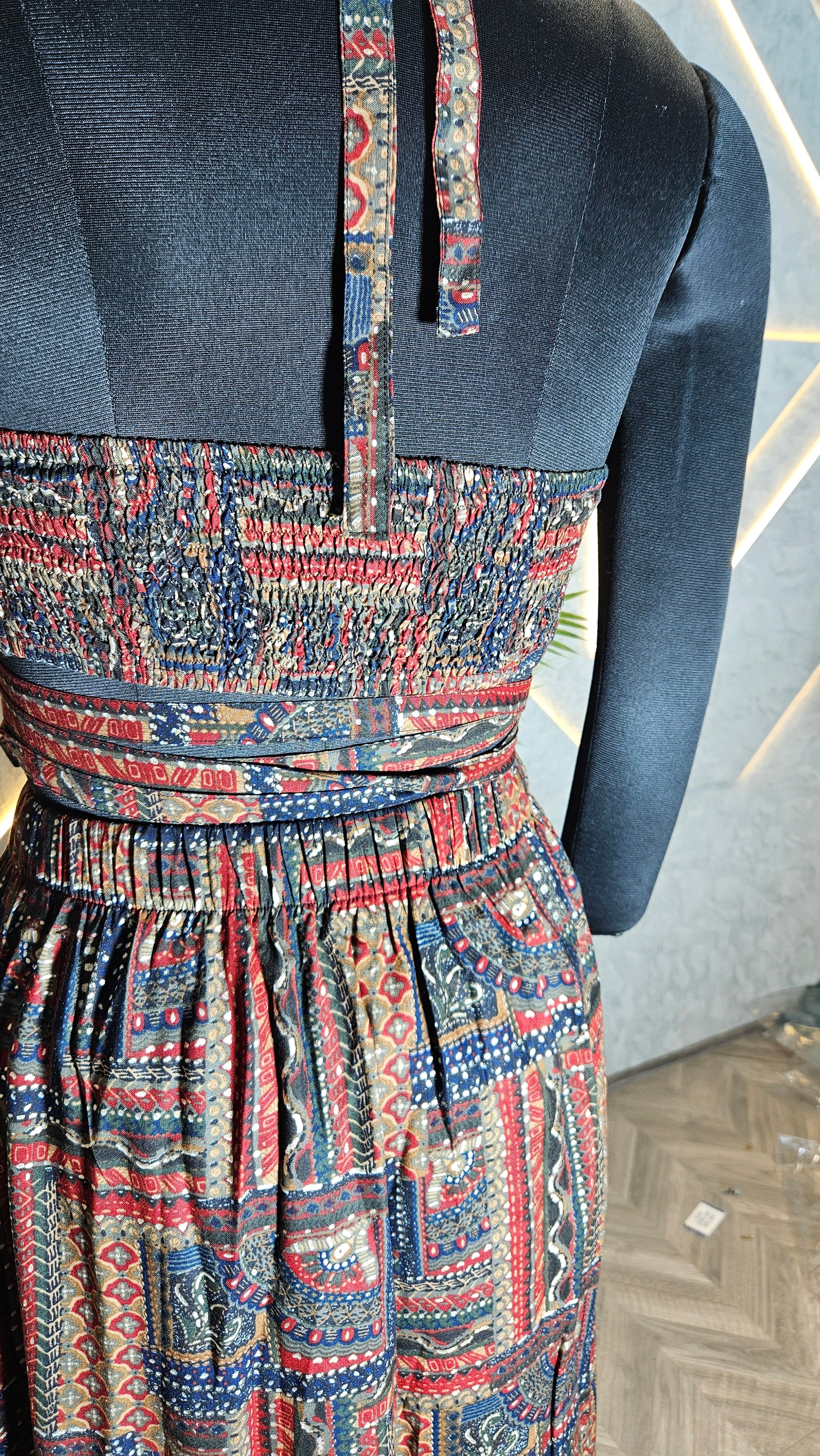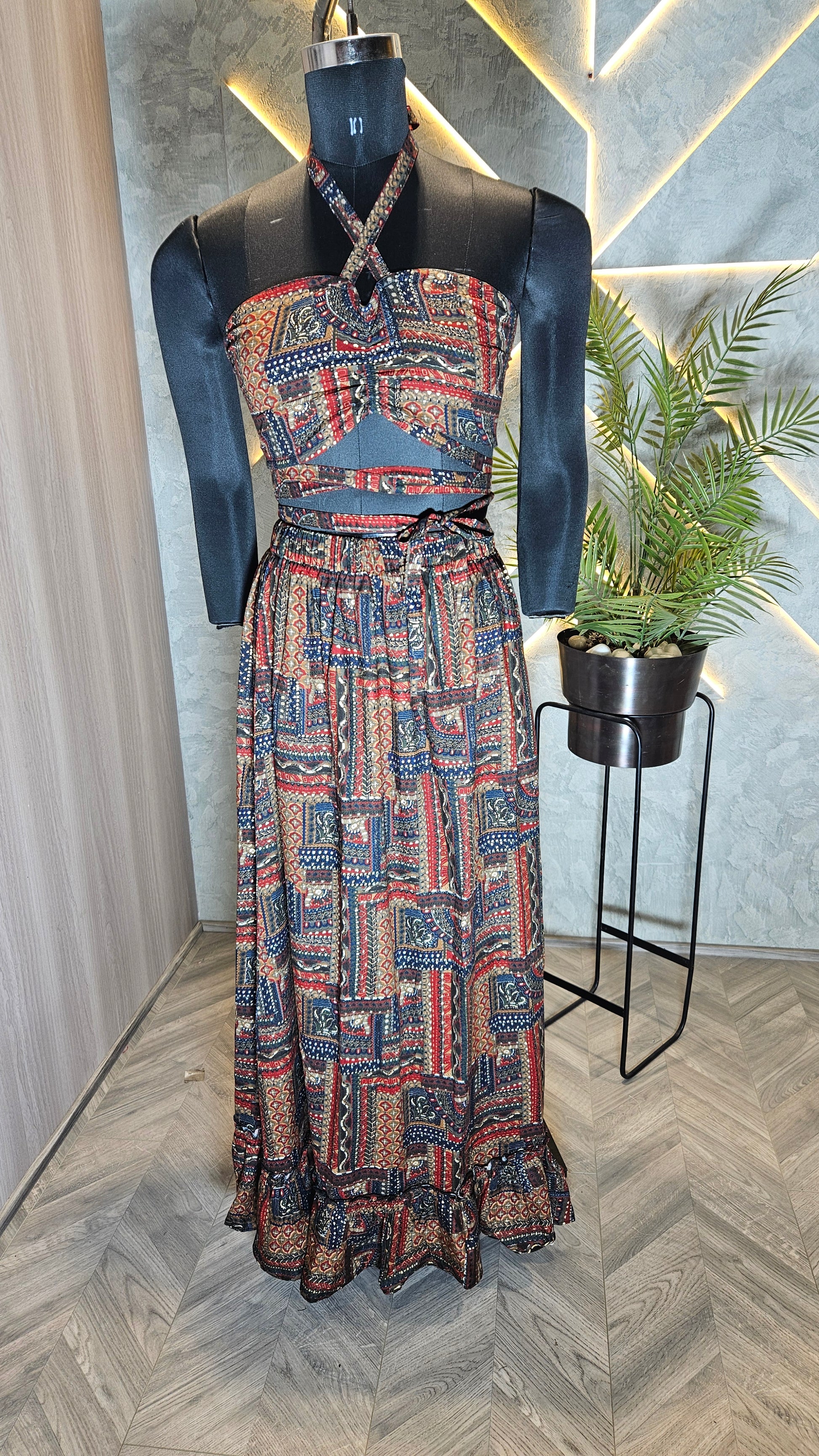 Introducing our Boho-Chic Halter Crop Top, a unique blend of traditional Indian artistry and contemporary design, perfect for fashion-forward global markets. Handcrafted with care, this top features a vibrant patchwork-inspired ethnic print, combining deep reds, earthy browns, indigos, and hints of gold, capturing the essence of Indian folk patterns.Designed with a criss-cross halter neckline and flattering cut-out detailing, the top ties elegantly at the back for a customizable fit. The lightweight and breathable fabric ensures comfort, making it ideal for summer festivals, beach outings, casual wear, or as a standout resort wear piece.