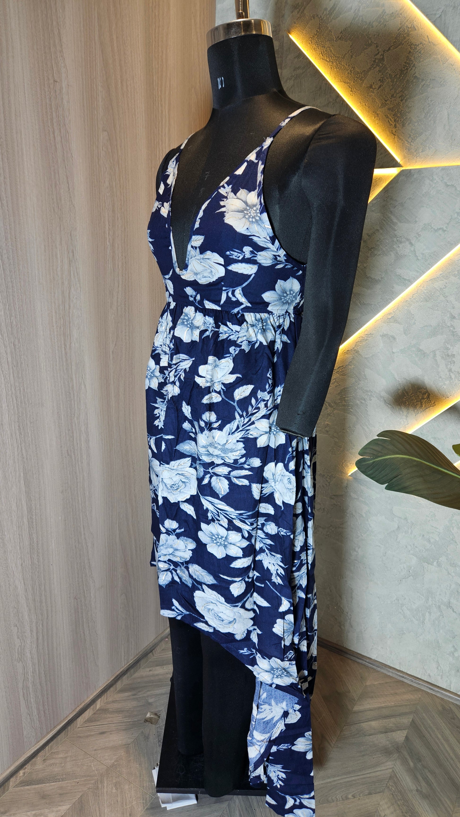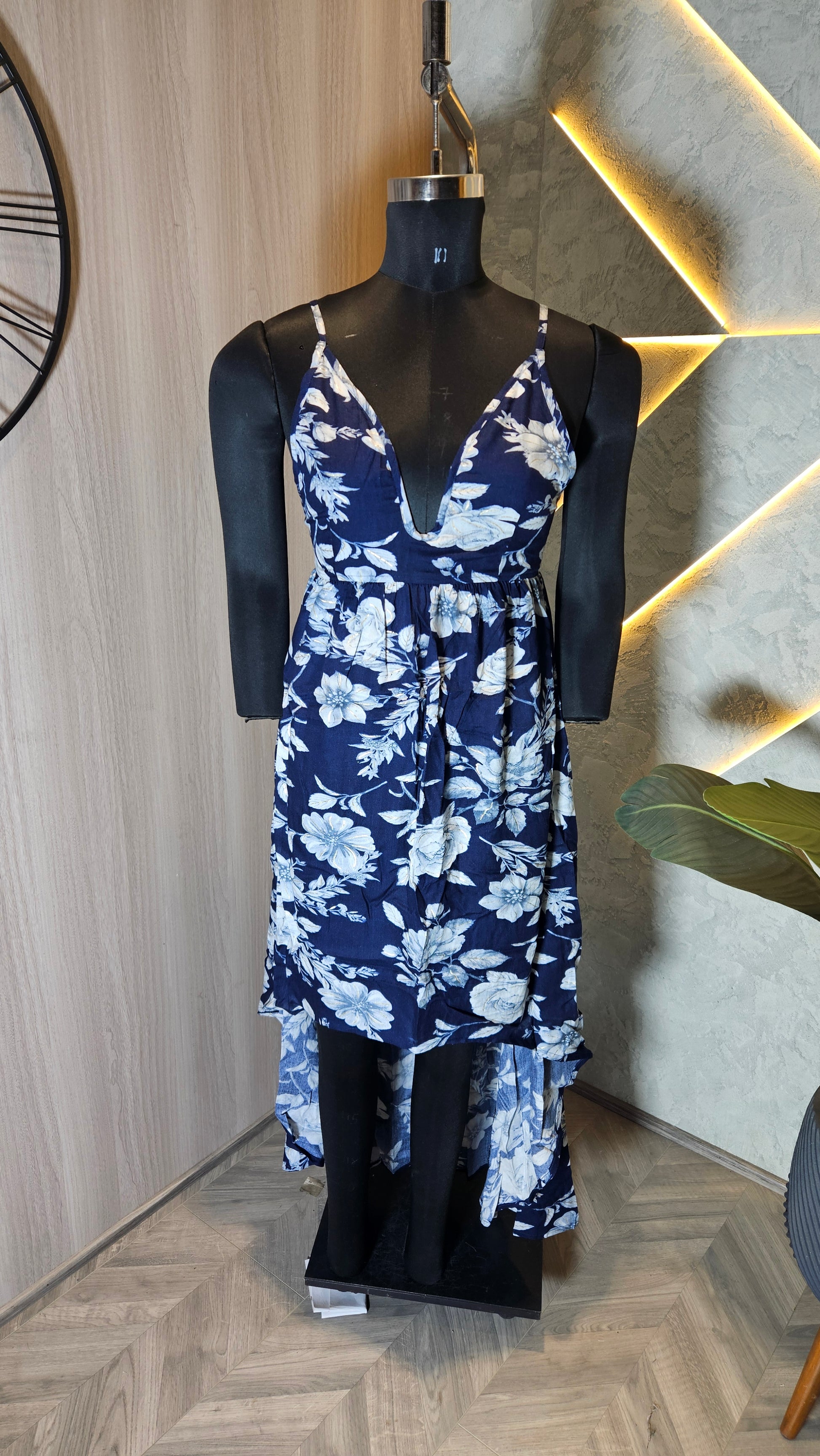 Featuring a deep V-neckline, adjustable spaghetti straps, and a high-low hemline, this piece strikes the perfect balance between chic and casual. The all-over white floral print on a navy blue base gives it a timeless, tropical appeal suitable for beach holidays, casual outings, or resort boutiques.