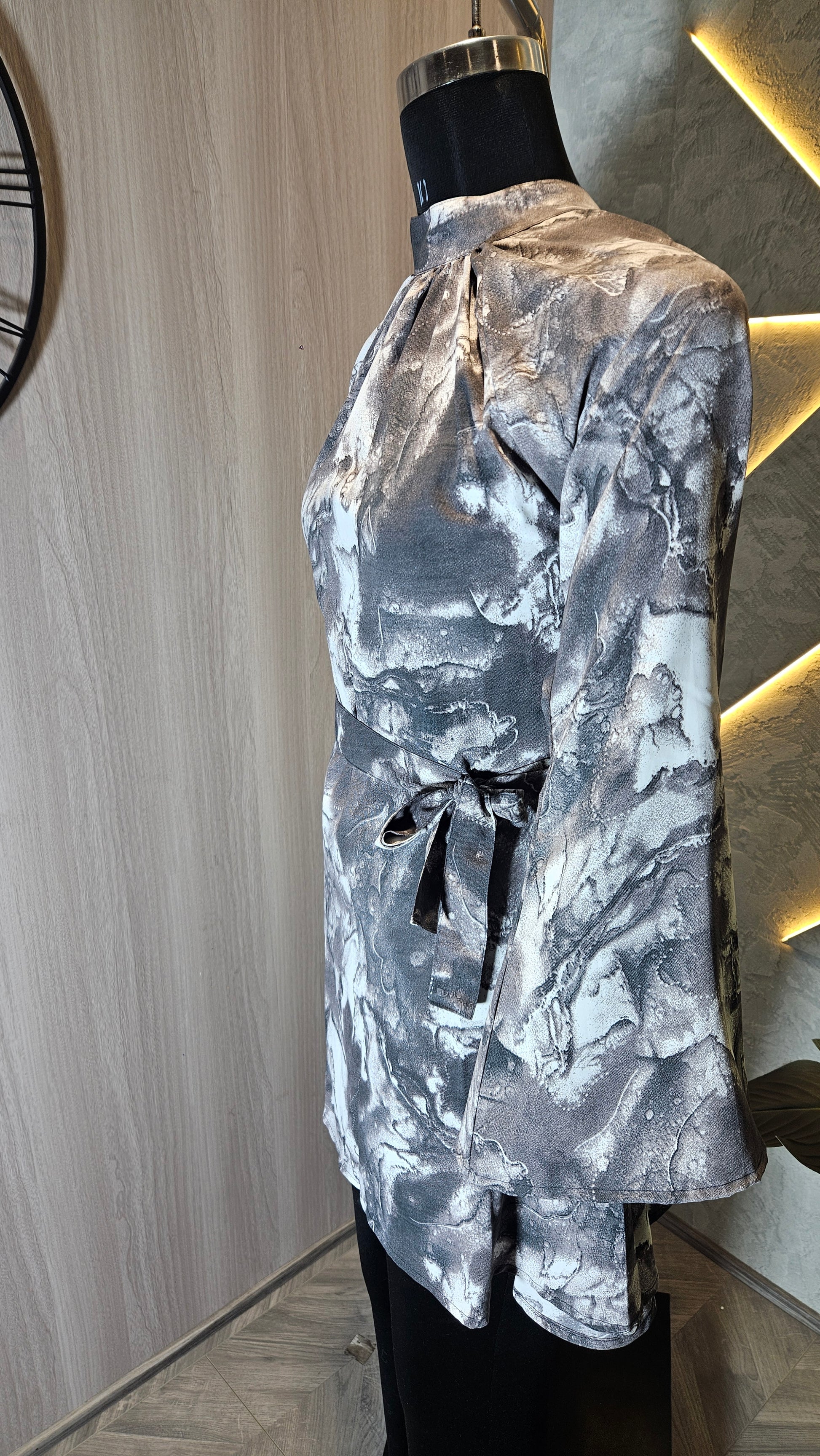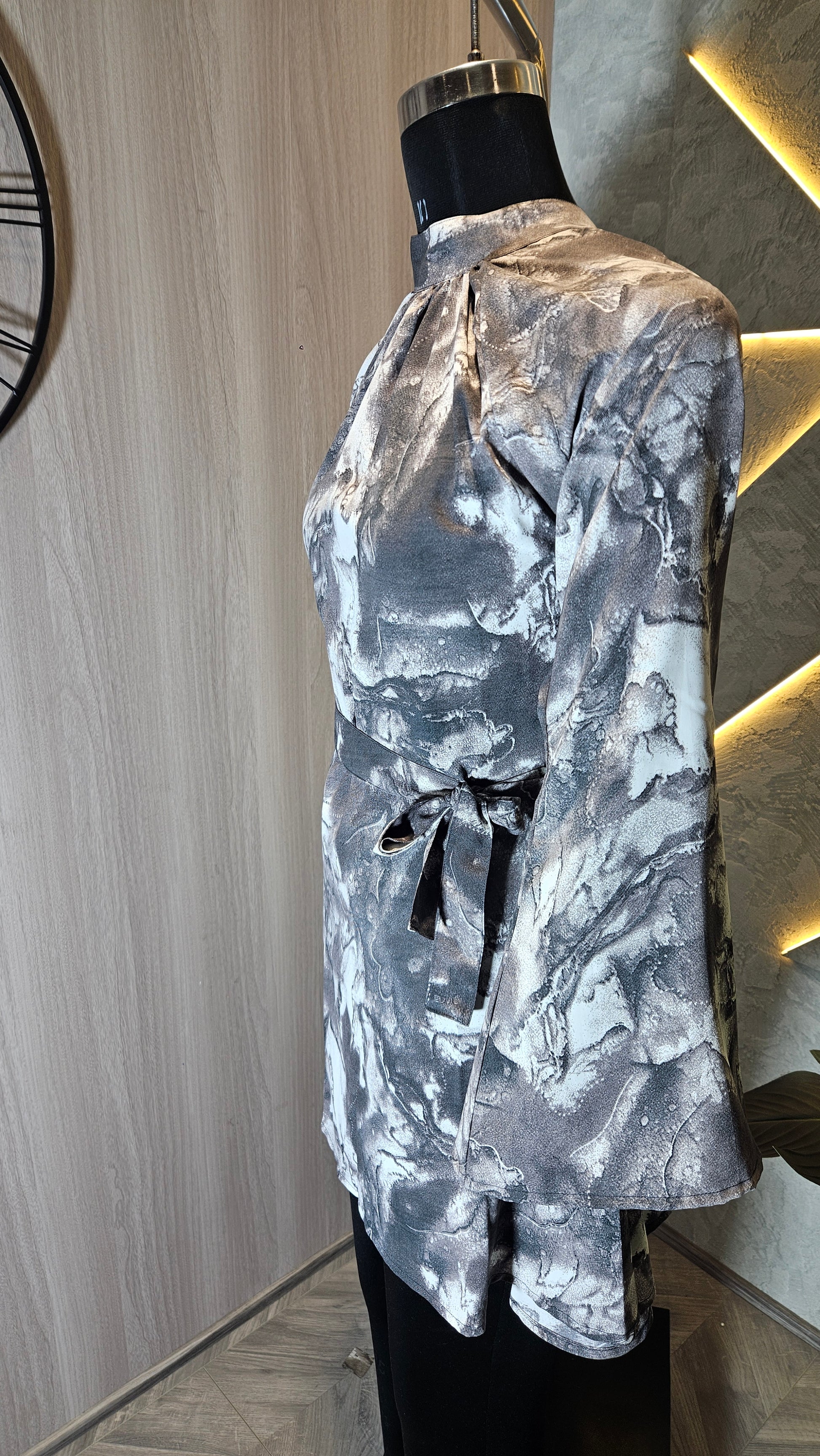 This top appears to be a stylish, modern piece with an abstract marble print in tones of gray and white. It features long sleeves with a slightly flared shape, a high neckline, and a waist tie, giving it an elegant yet trendy appearance. The design is minimalistic and chic, making it versatile for various occasions, from casual outings to semi-formal events.