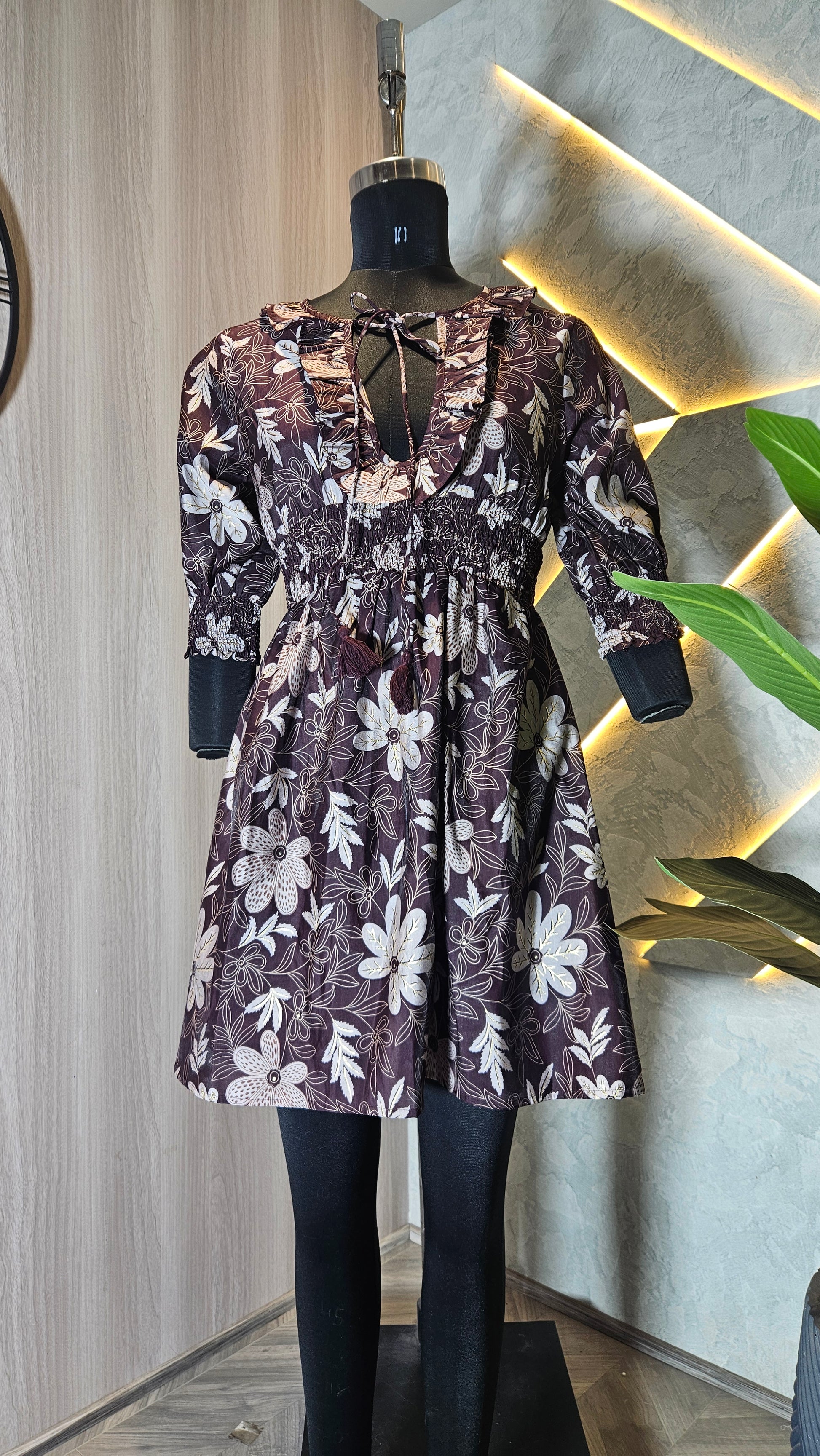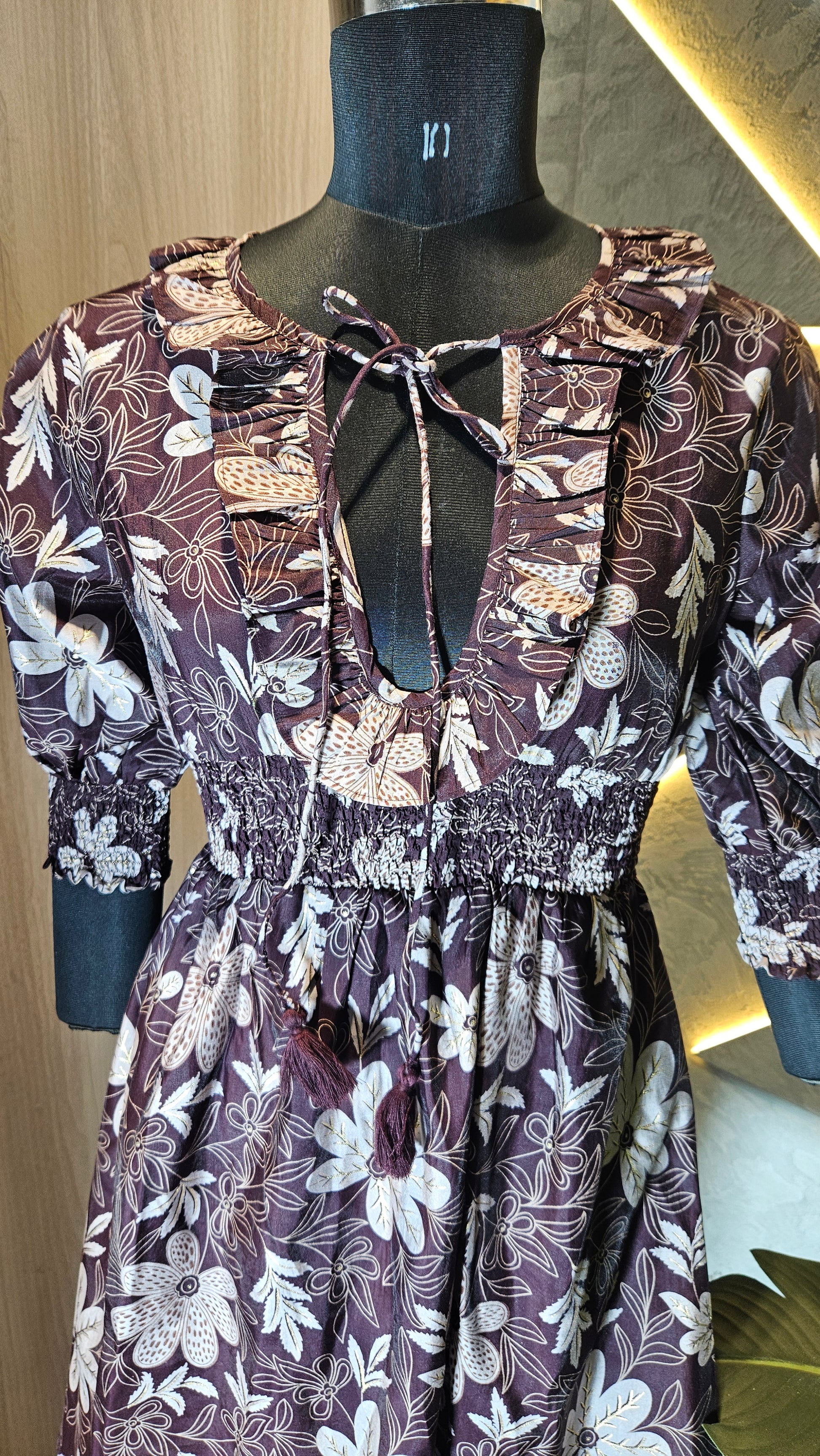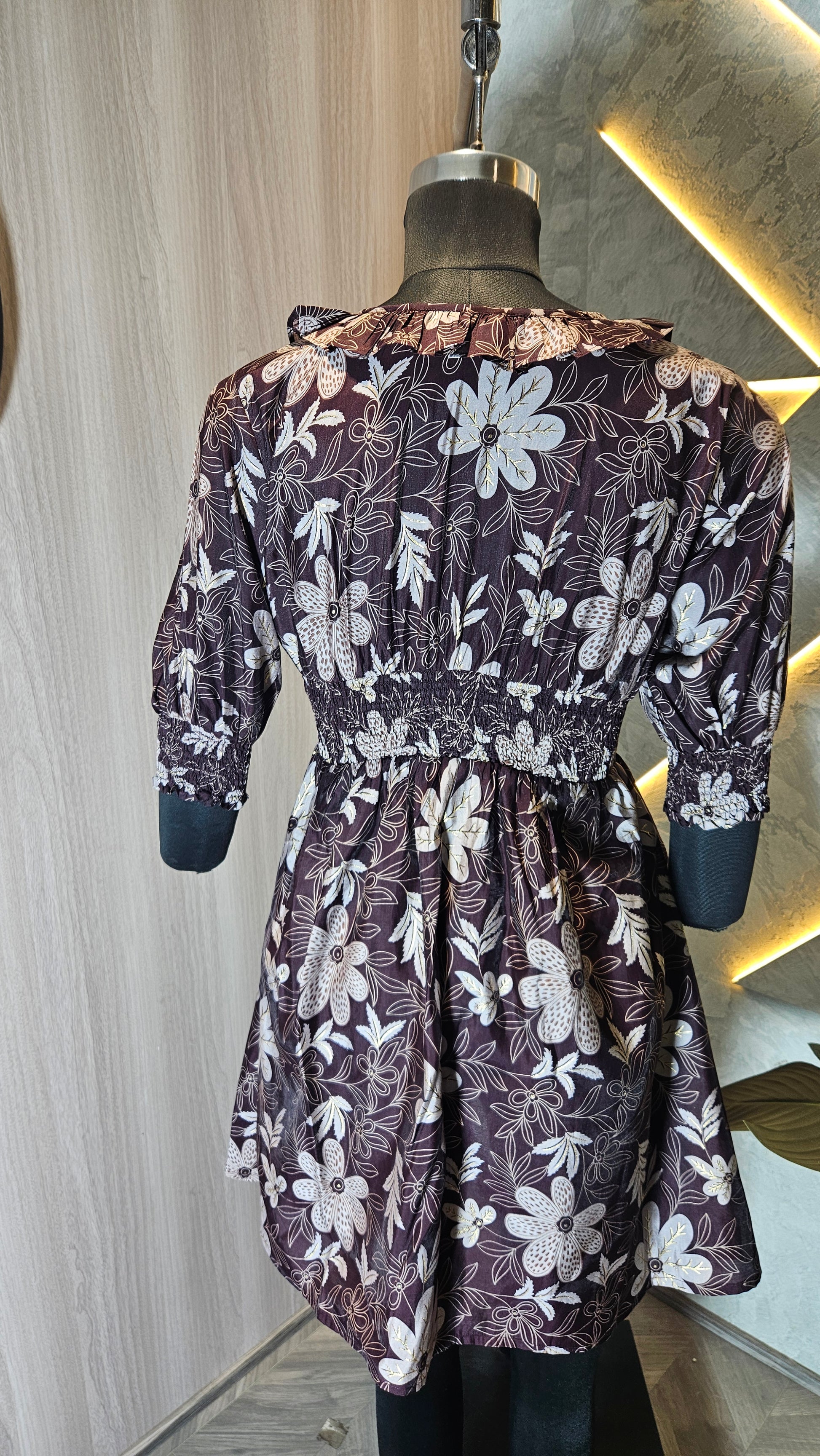 The design boasts a deep V-neckline with ruffle detailing and tie-up strings for added flair. The smocked waist and cuffs provide a flattering silhouette while ensuring comfort and ease of movement. The 3/4 puff sleeves add a trendy touch, making it a versatile piece for pairing with jeans, leggings, or skirts.