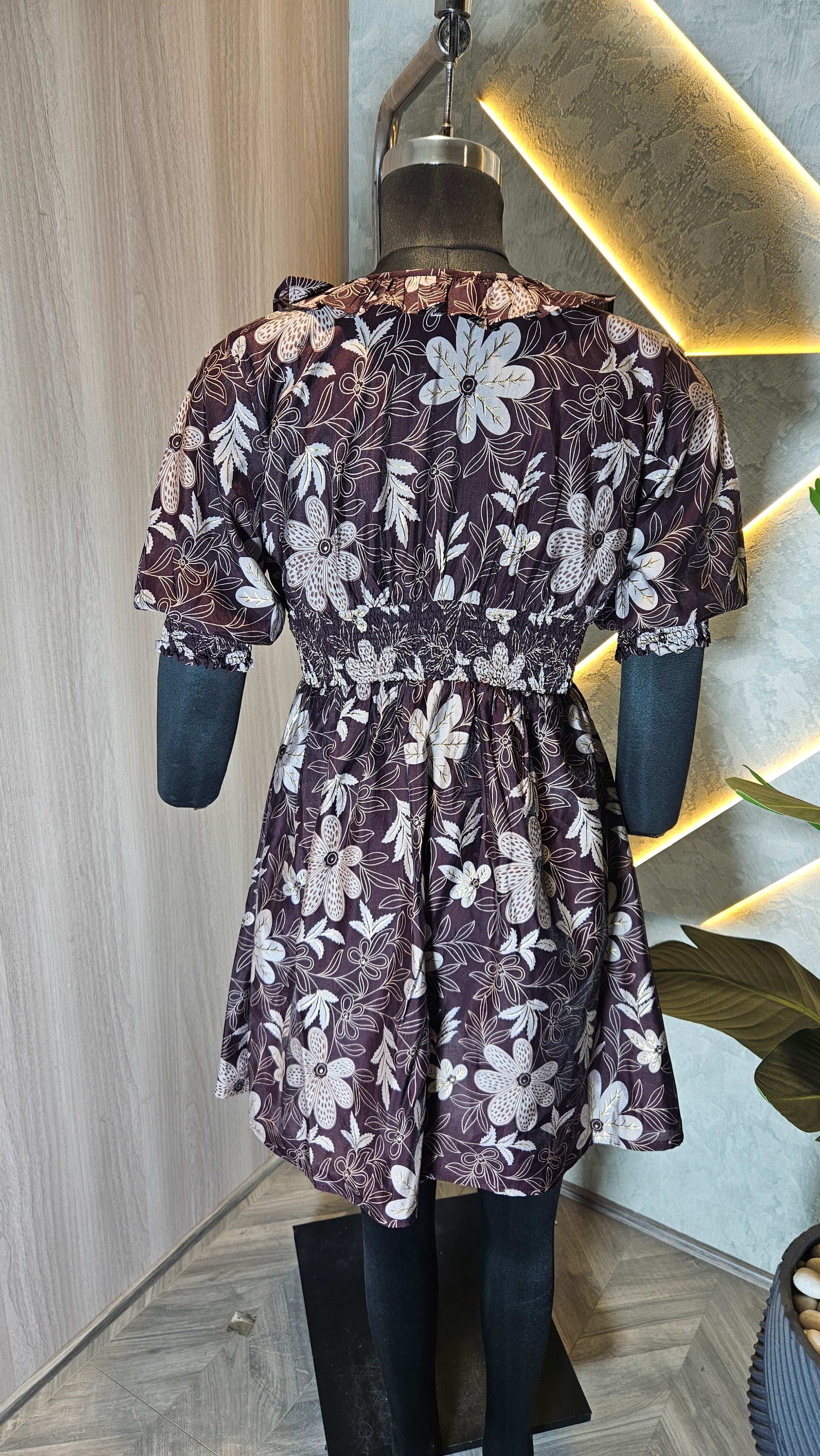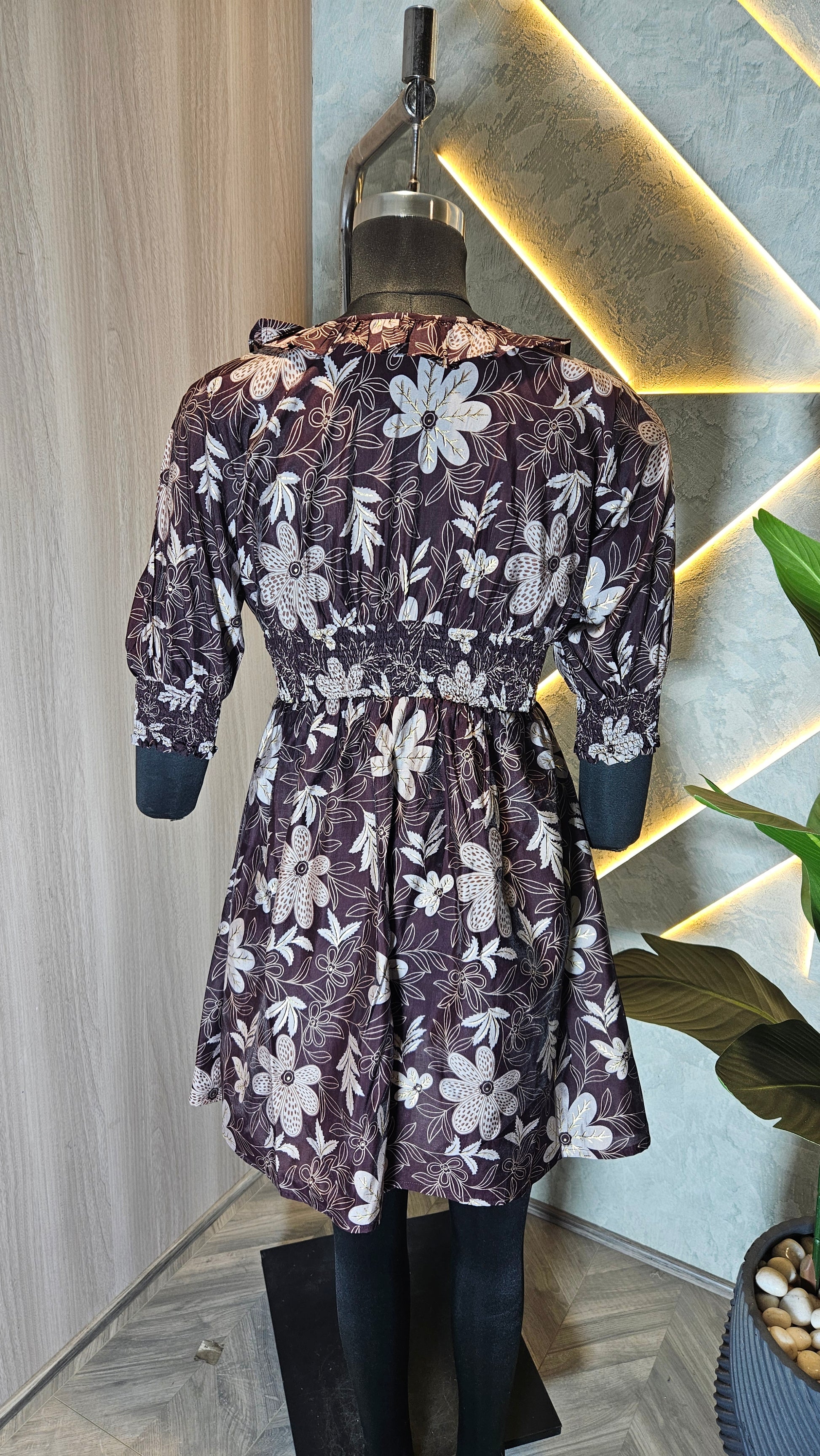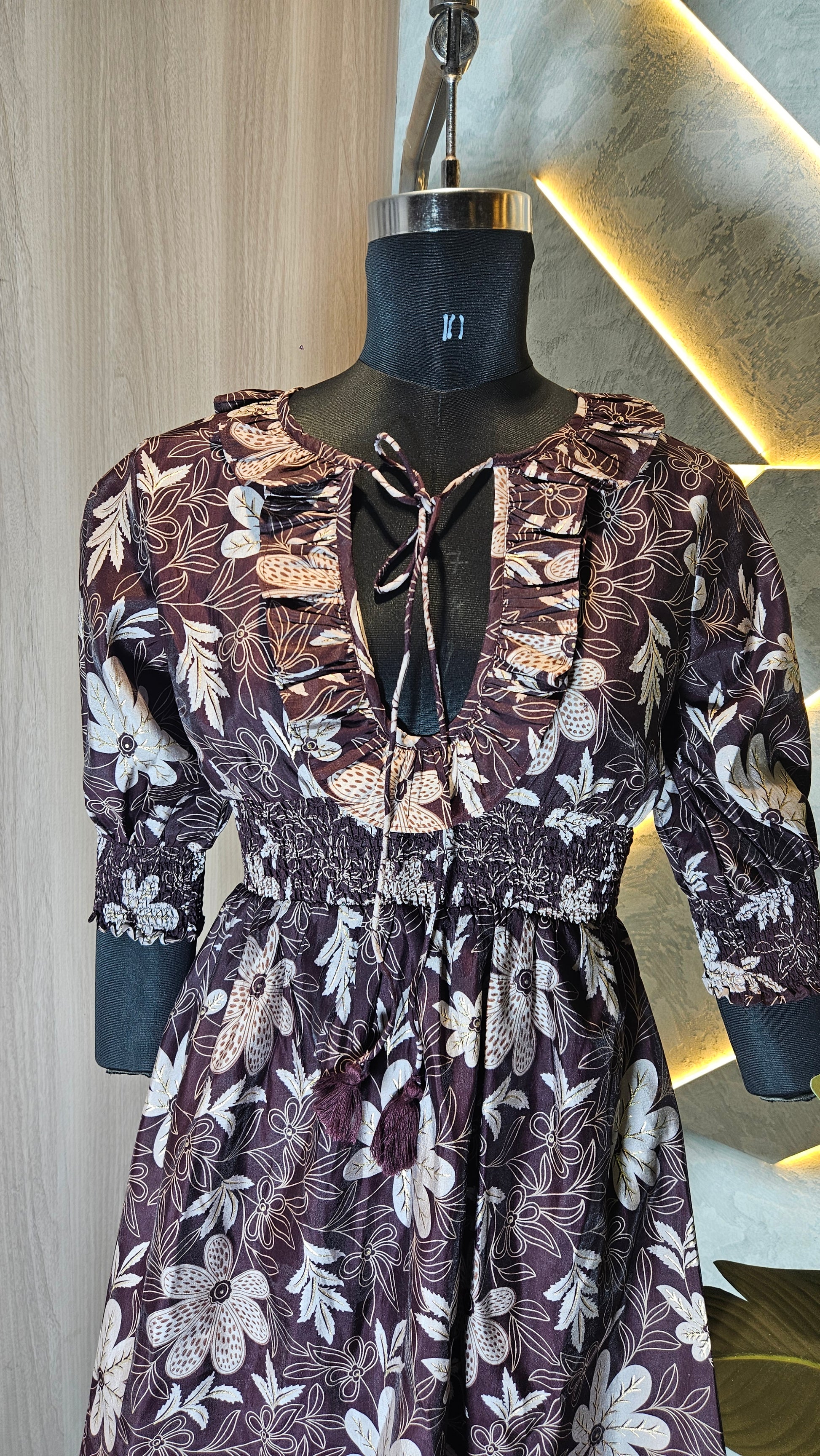 The design boasts a deep V-neckline with ruffle detailing and tie-up strings for added flair. The smocked waist and cuffs provide a flattering silhouette while ensuring comfort and ease of movement. The 3/4 puff sleeves add a trendy touch, making it a versatile piece for pairing with jeans, leggings, or skirts.