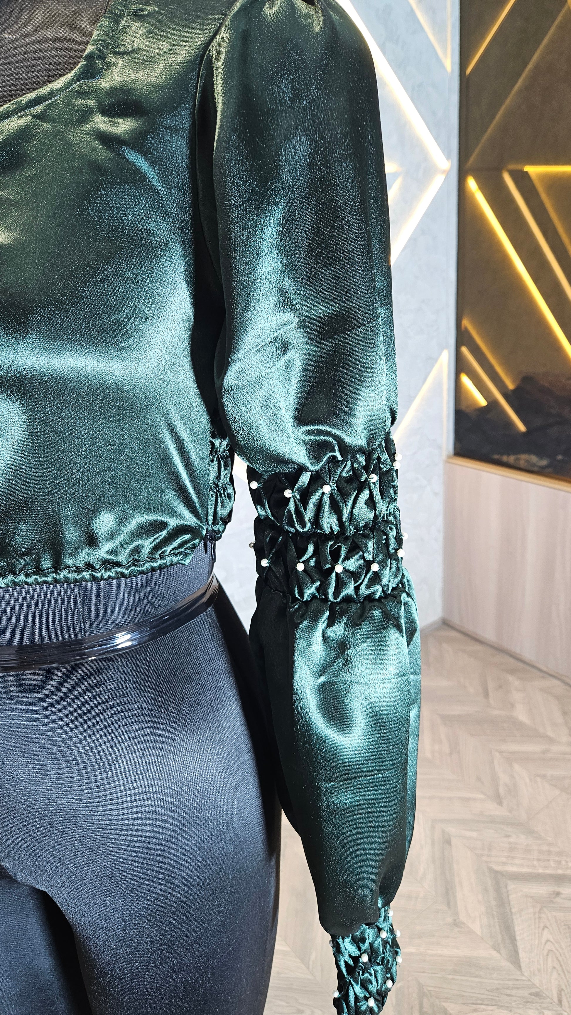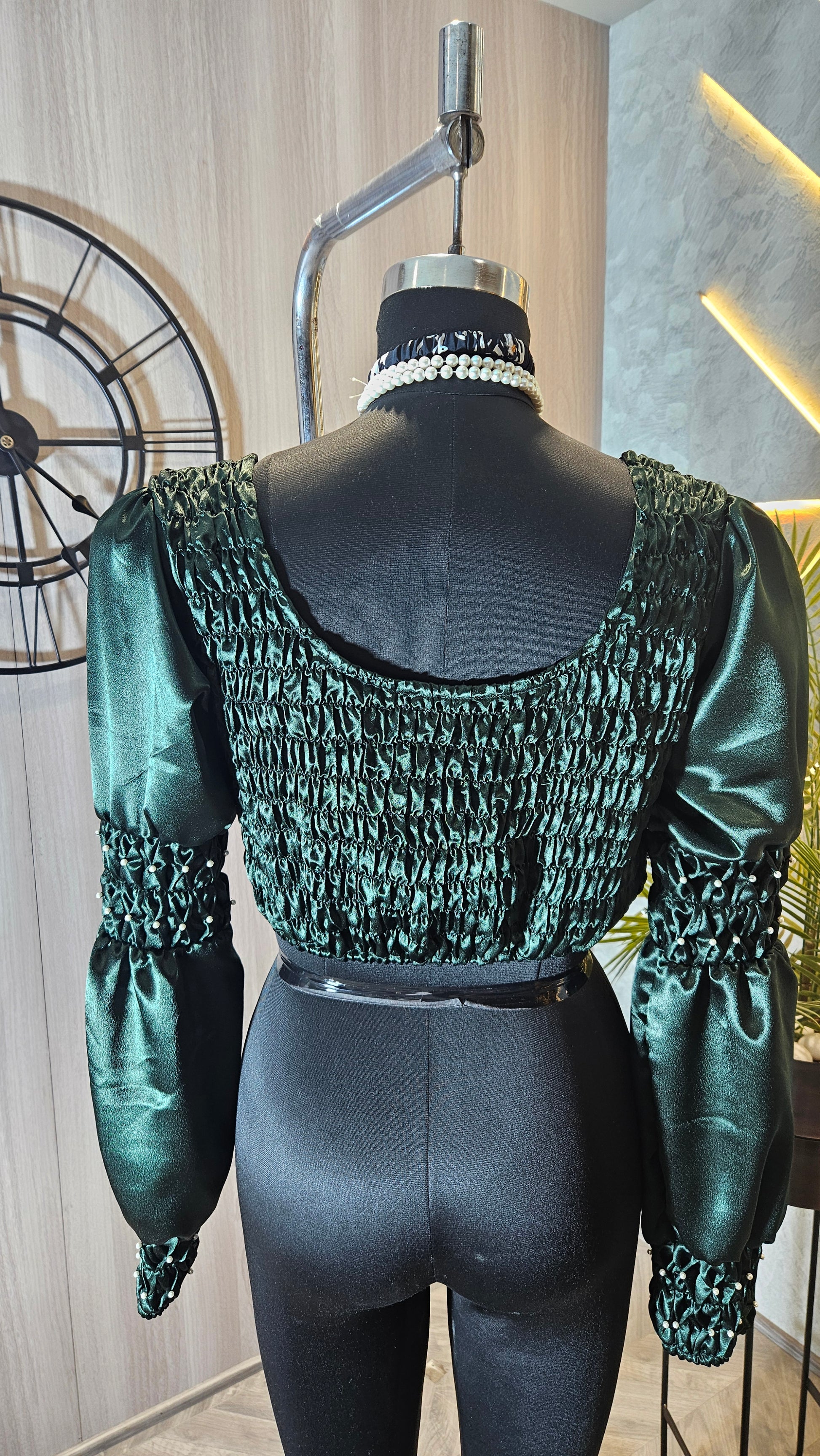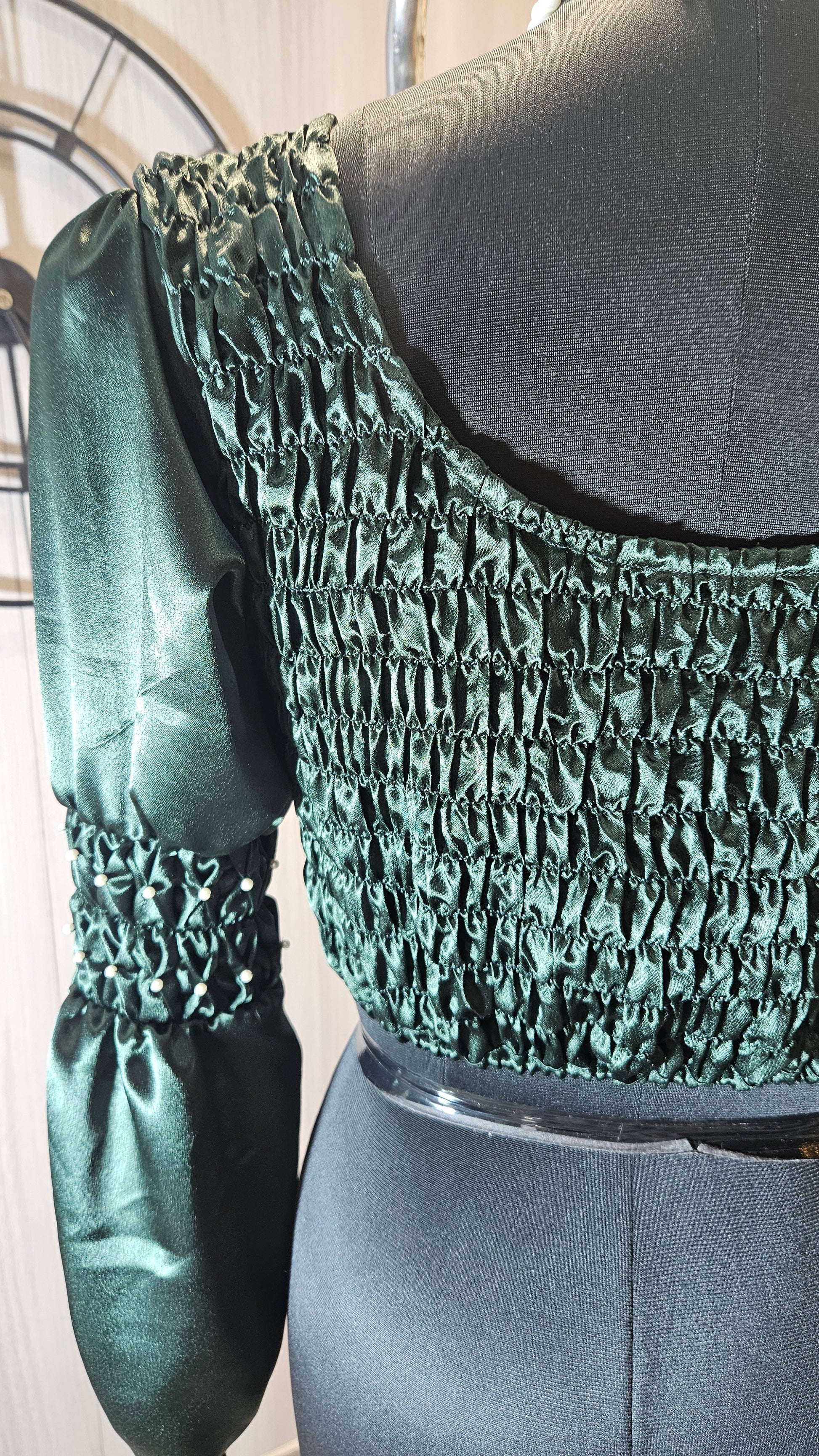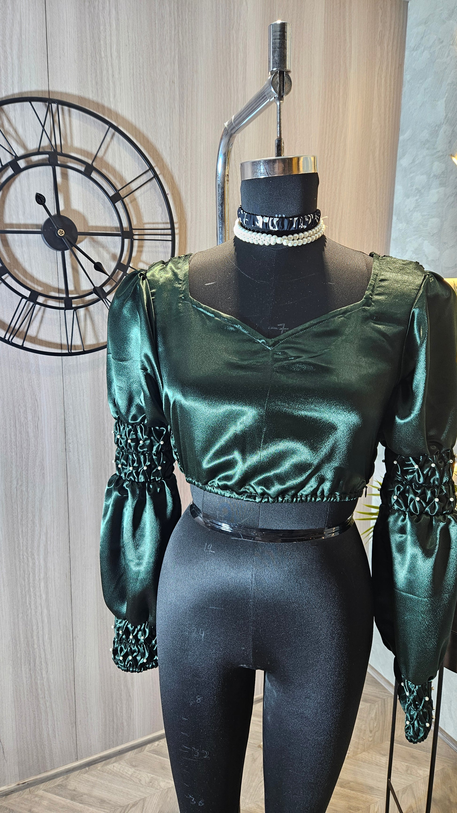 This elegant women’s cotton top is designed with a luxurious sheen and premium finish, making it ideal for fashion-forward markets worldwide. Crafted in India with high-quality fabric, it features a flattering neckline, puffed sleeves with intricate smocking and bead accents, and a comfortable cropped fit with an elasticated waistline. The rich emerald green shade adds a touch of sophistication, suitable for both partywear and festive occasions.