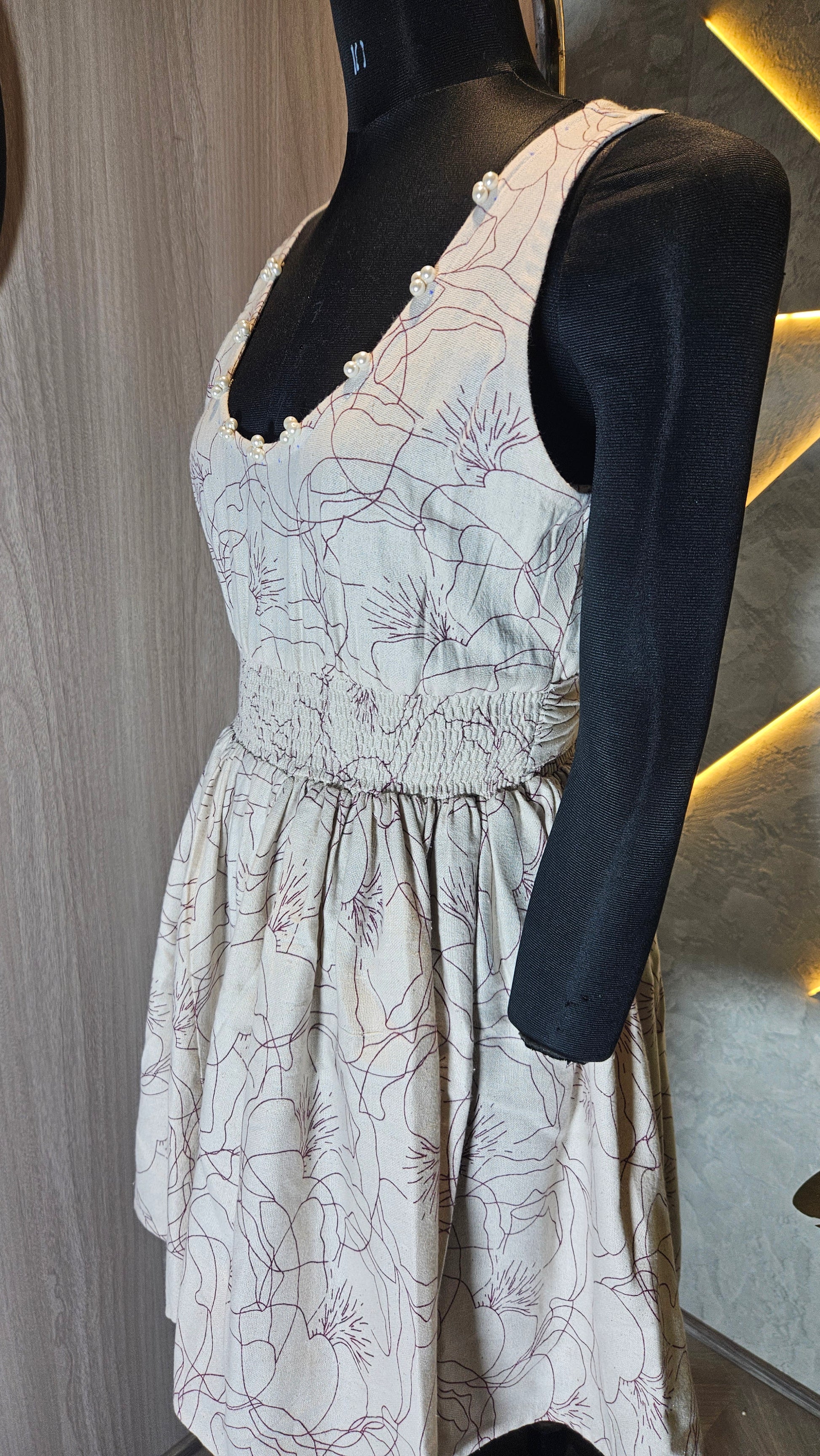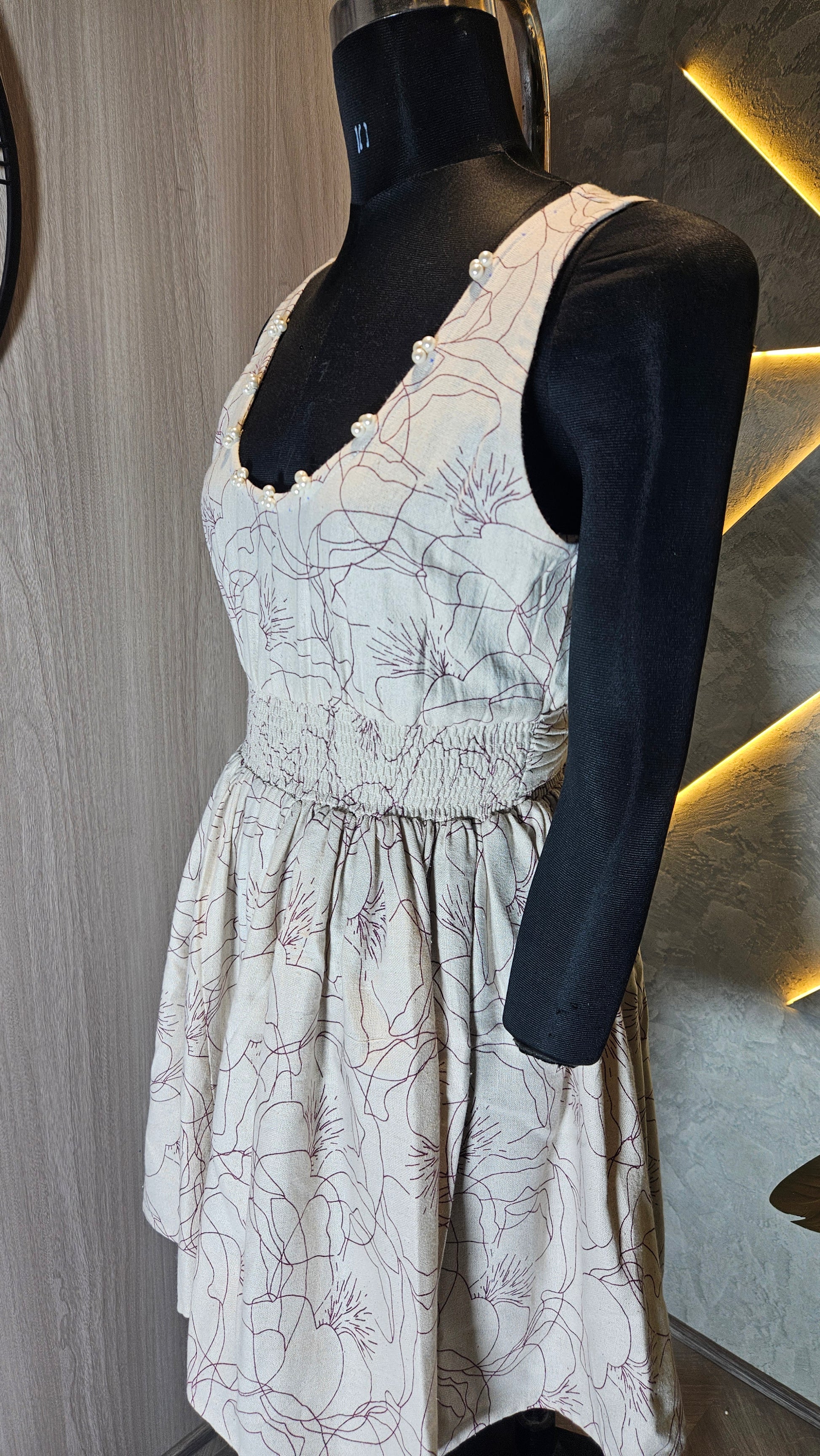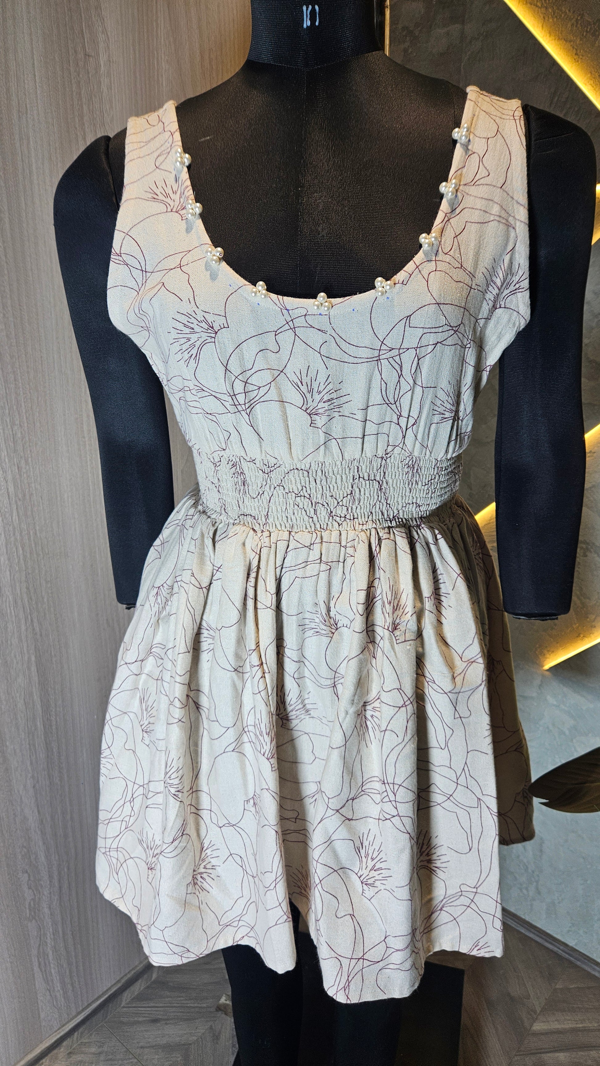 Introducing our stylish and comfortable sleeveless cotton top, expertly crafted in India for the global fashion market. This elegant top features a soft beige base with subtle floral line art, adding a sophisticated and timeless touch. The scooped neckline is delicately finished with small decorative beads for added charm, while the smocked bodice ensures a flattering and flexible fit for all body types.Designed with breathable, lightweight 100% cotton fabric, this top is perfect for summer wear, casual outings, or vacation wardrobes. The A-line silhouette gently flares from the waist, providing comfort and ease of movement.