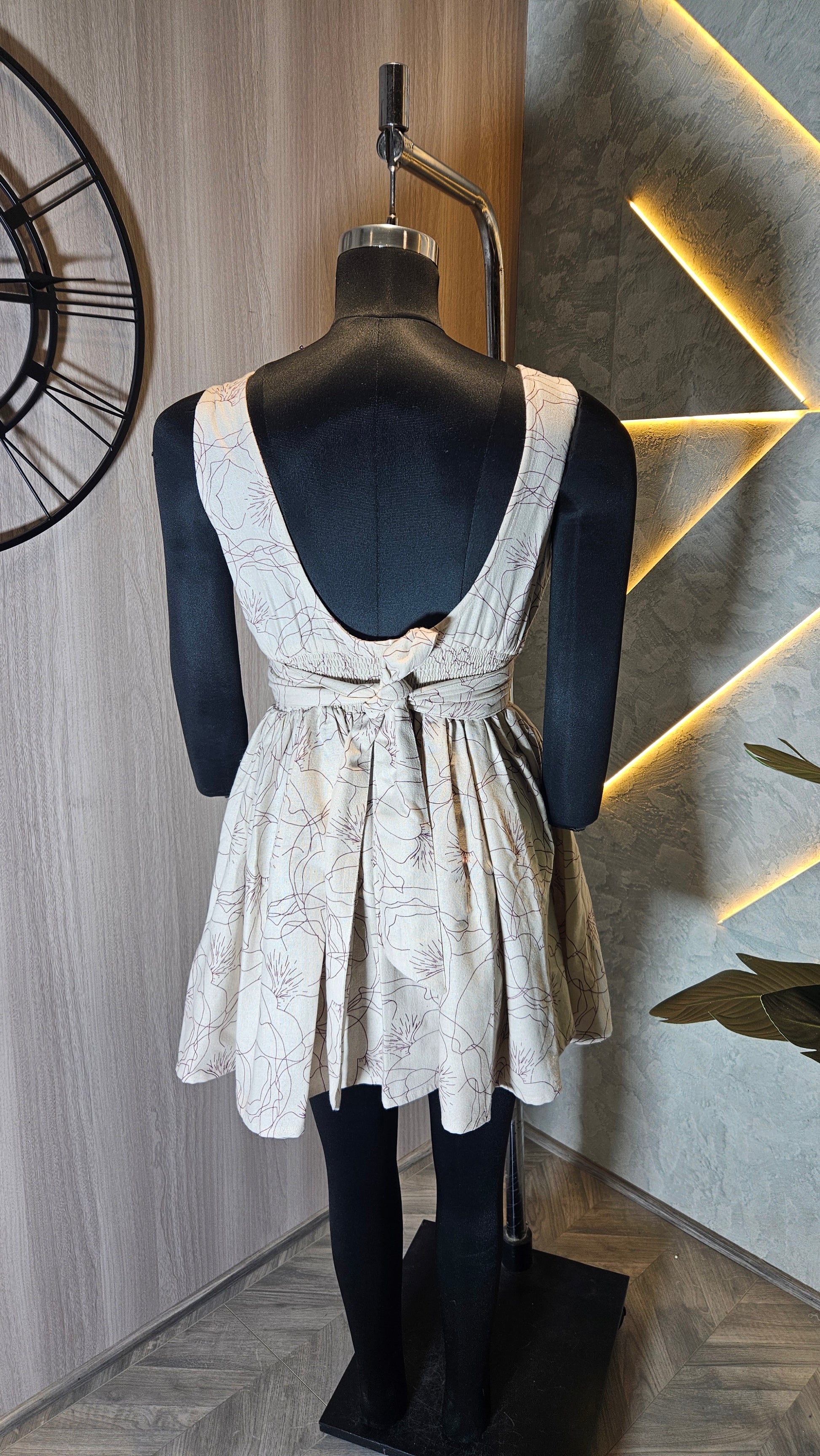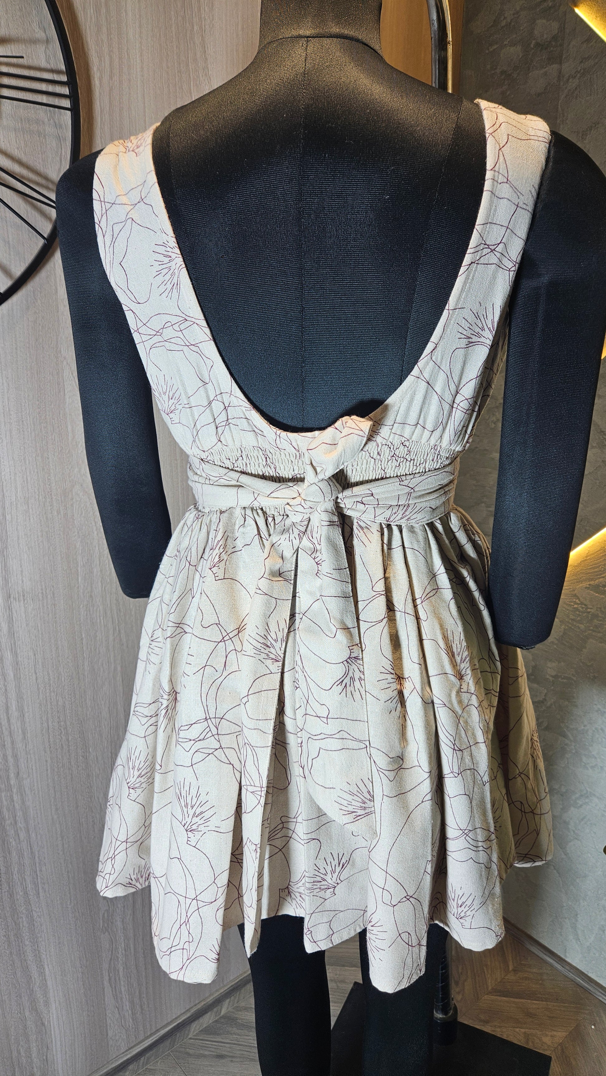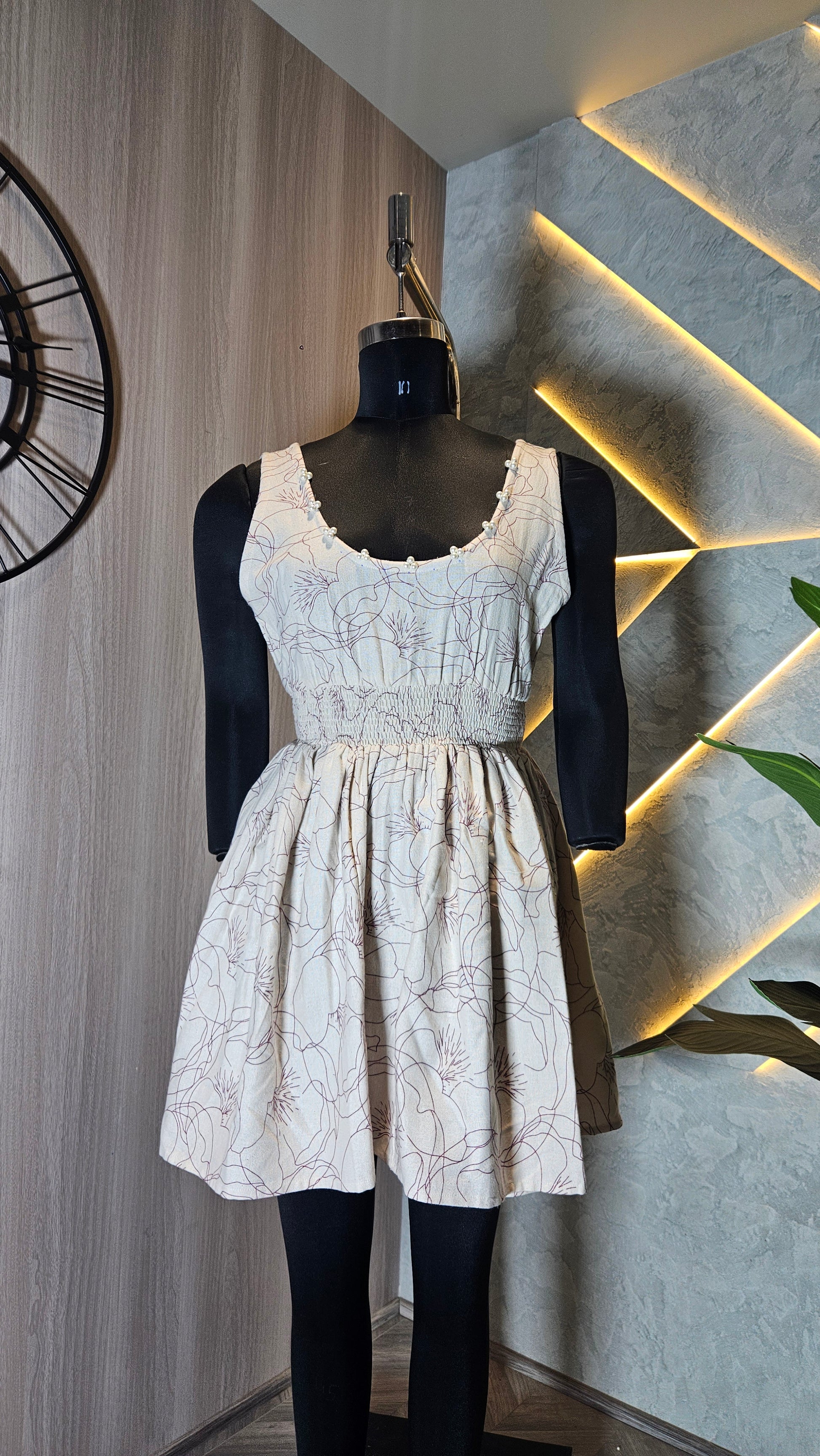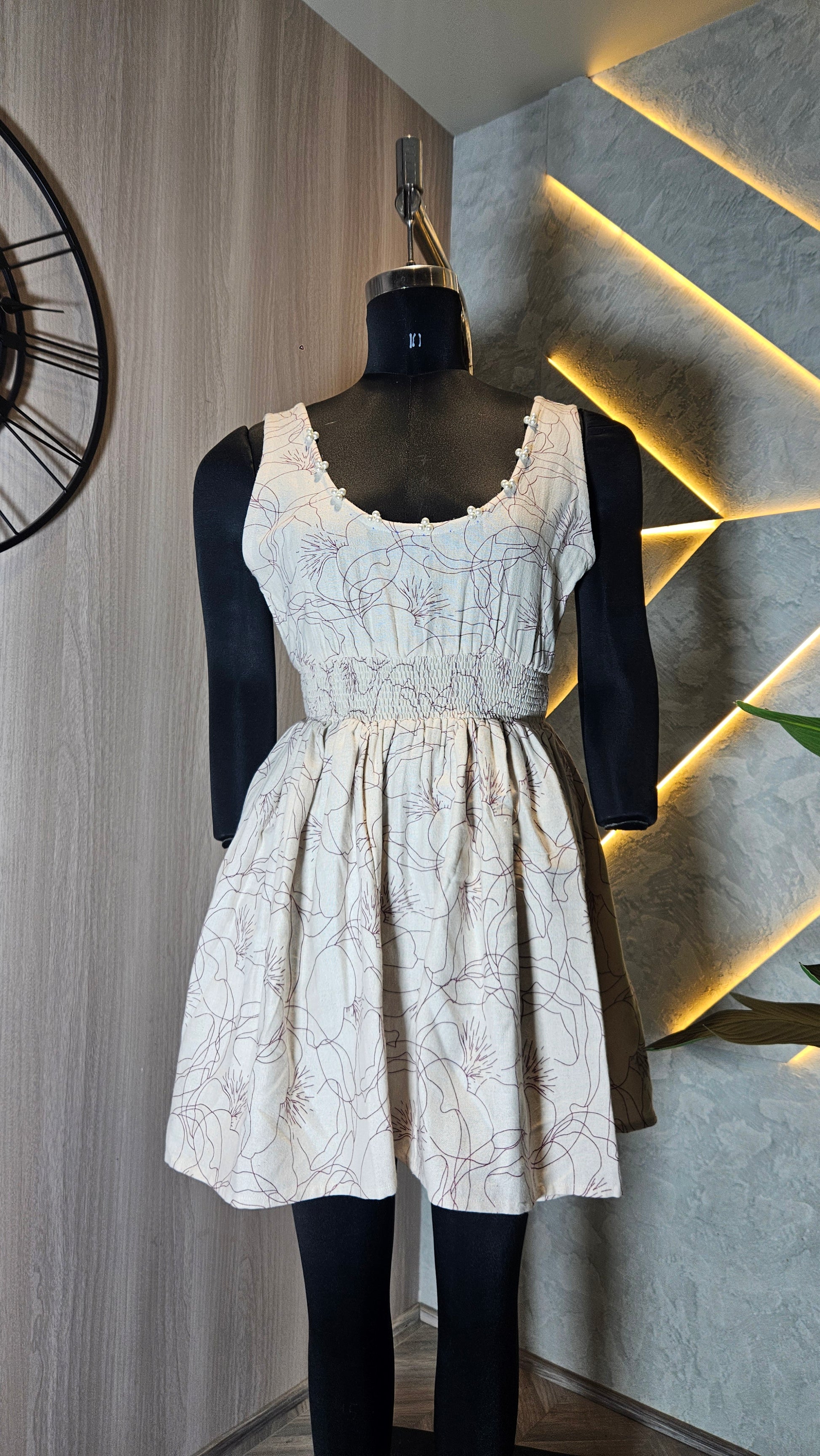 Introducing our stylish and comfortable sleeveless cotton top, expertly crafted in India for the global fashion market. This elegant top features a soft beige base with subtle floral line art, adding a sophisticated and timeless touch. The scooped neckline is delicately finished with small decorative beads for added charm, while the smocked bodice ensures a flattering and flexible fit for all body types.Designed with breathable, lightweight 100% cotton fabric, this top is perfect for summer wear, casual outings, or vacation wardrobes. The A-line silhouette gently flares from the waist, providing comfort and ease of movement.
