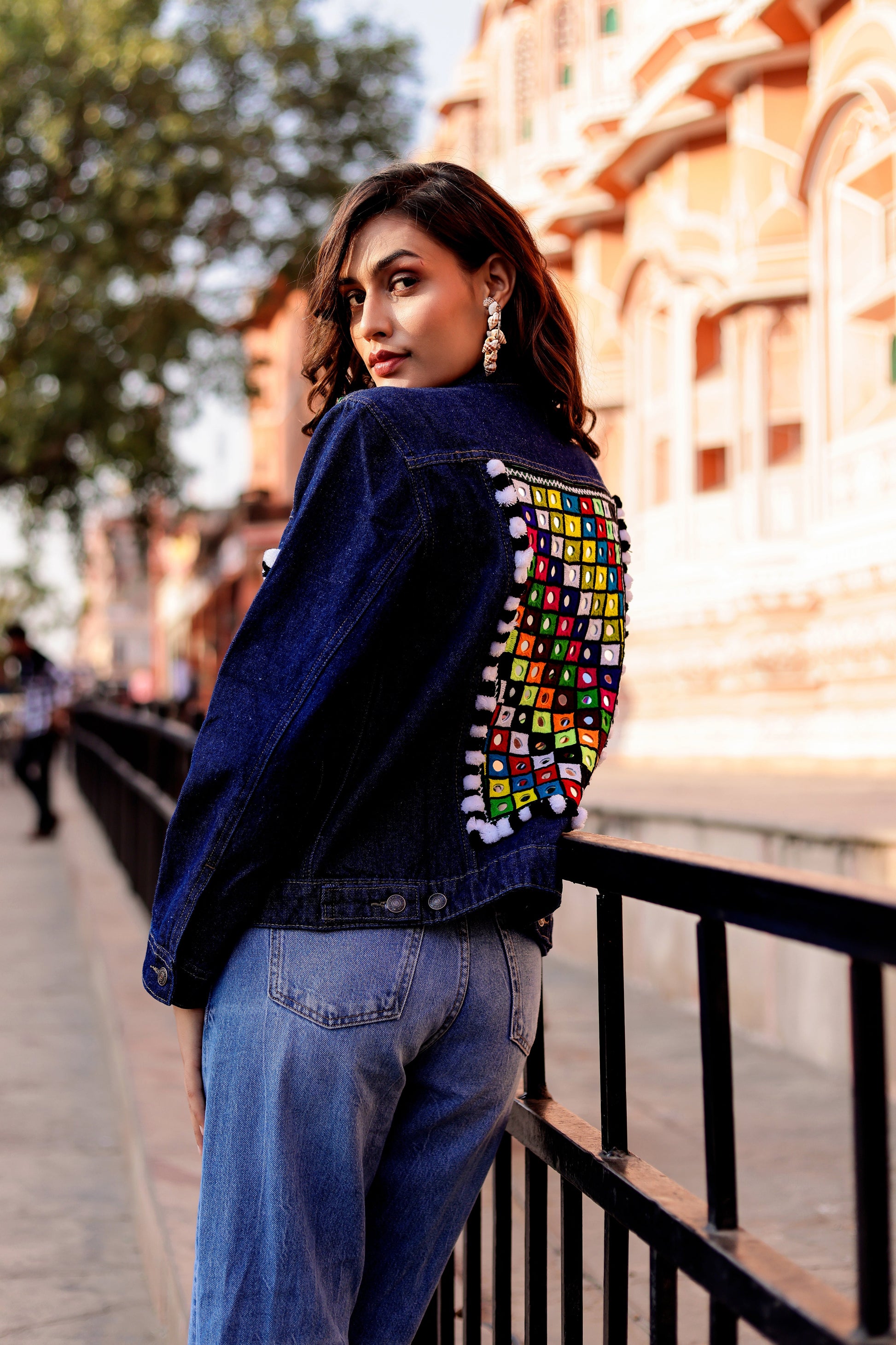 Make a bold statement with this stunning fusion of Indian artistry and contemporary fashion. This jacket blends the rugged charm of denim with the intricate beauty of traditional shisha mirror embroidery, creating a masterpiece of cultural craftsmanship.
