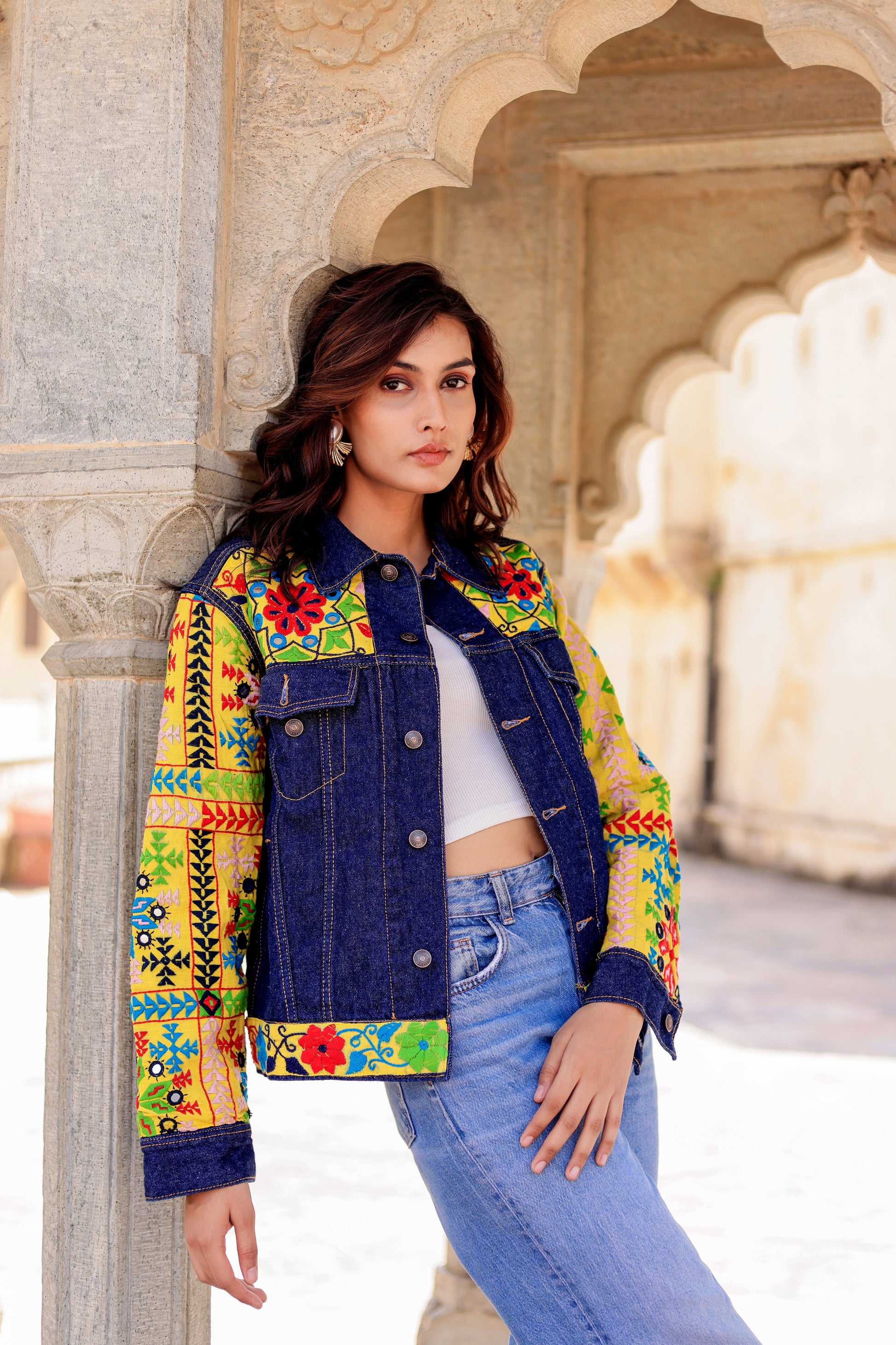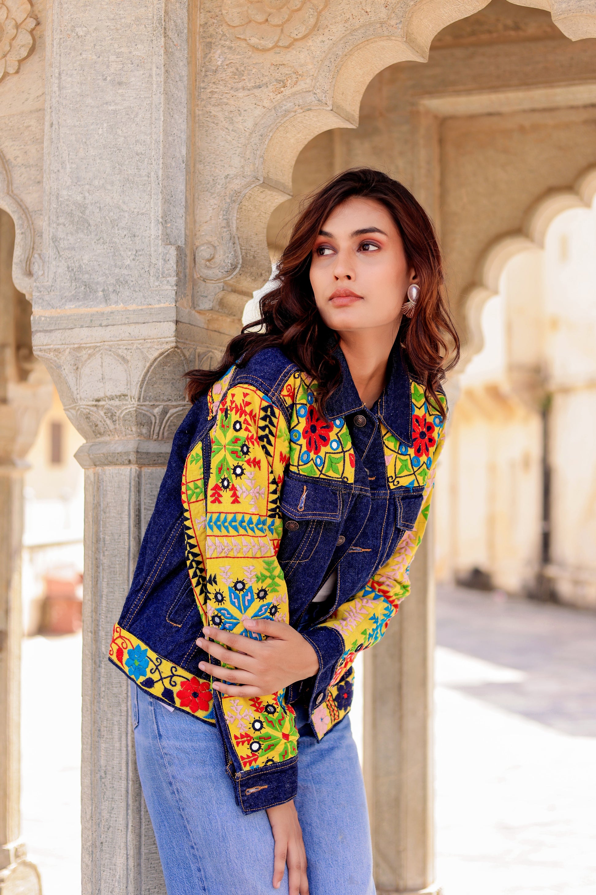 Celebrate heritage and individuality with this stunning denim jacket, skillfully adorned with hand embroidery crafted by artisans from small villages of India. This unique fusion of traditional craftsmanship and contemporary fashion is a true testament to the rich cultural legacy of Indian embroidery.