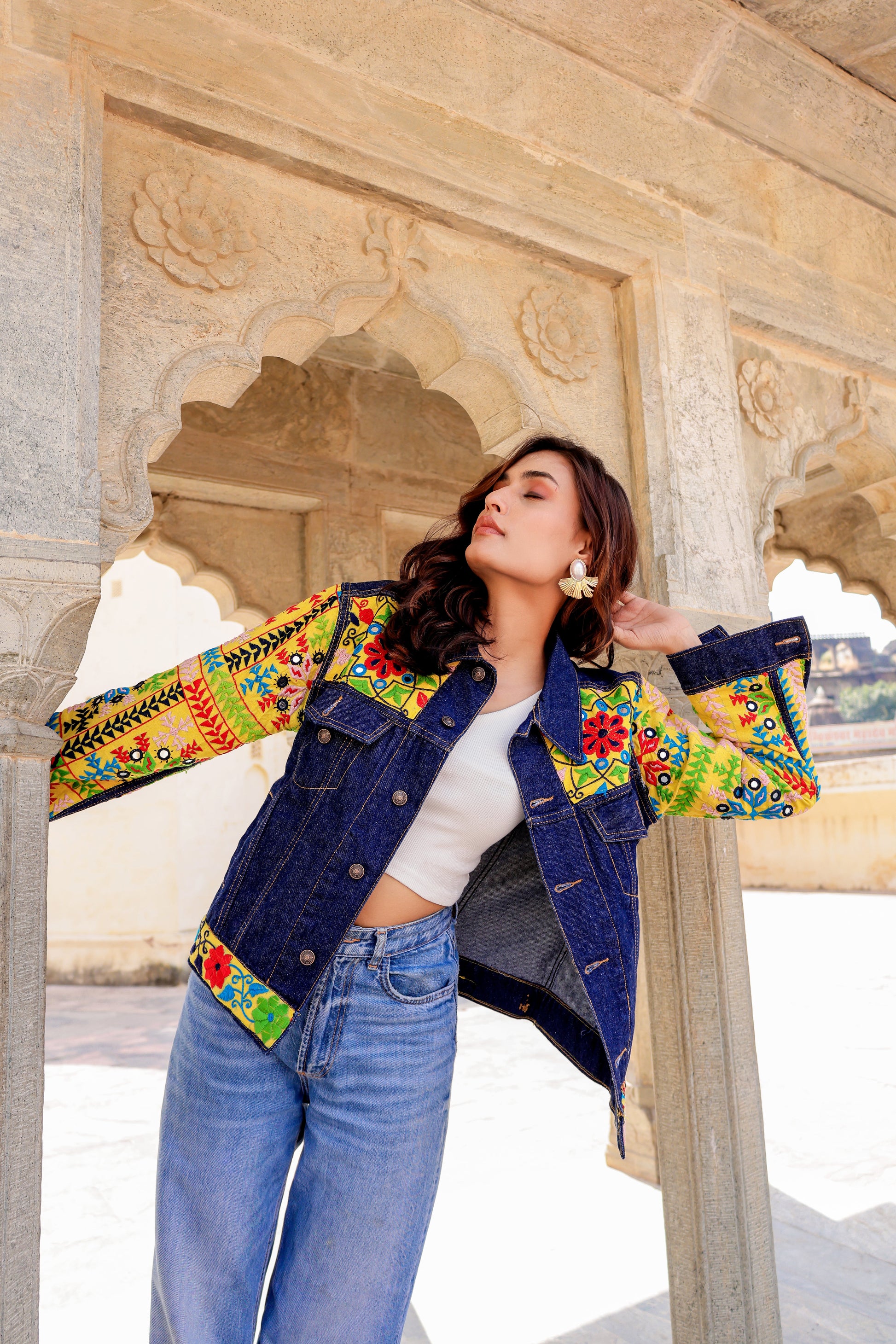 Cultural Wave Denim Jacket with Intricate Handmade Work